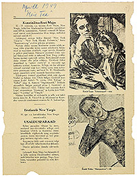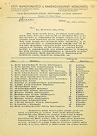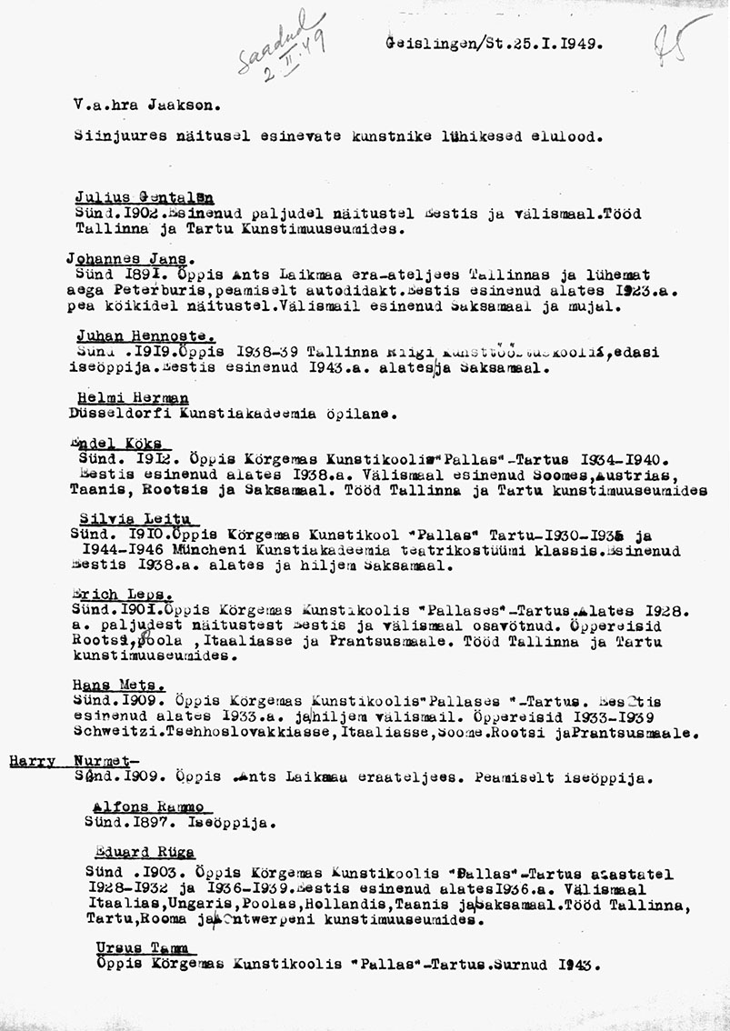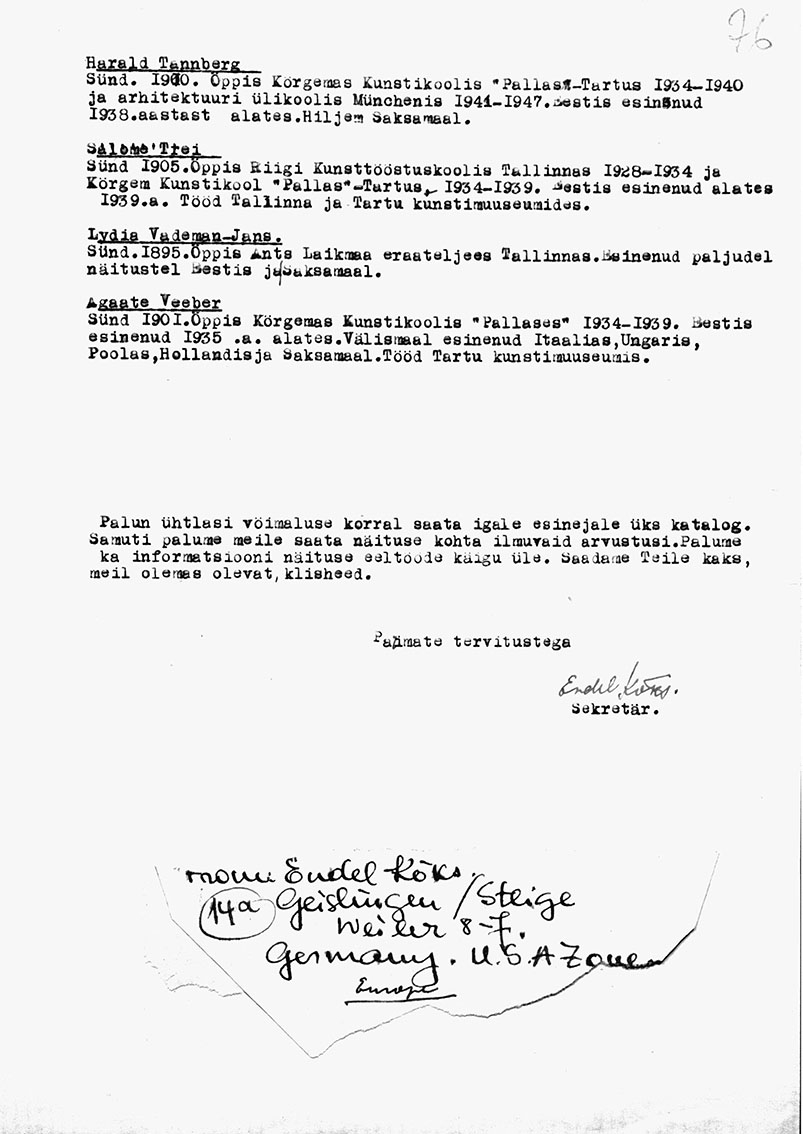 | Short biographies of the Estonian artists performing their works in Estonian House in New York on March 12–19, 1949. Sent on January 25, 1949, by Endel Kõks from Geislingen to Ernst Jaakson who lead the exhibition's arrangement committee. ERA.1608.2.954, pages 75–76 (digitized, www.ra.ee/saaga) |
