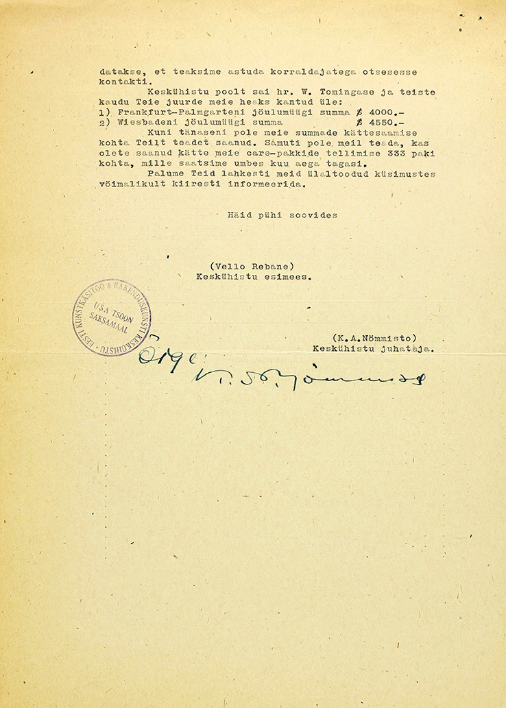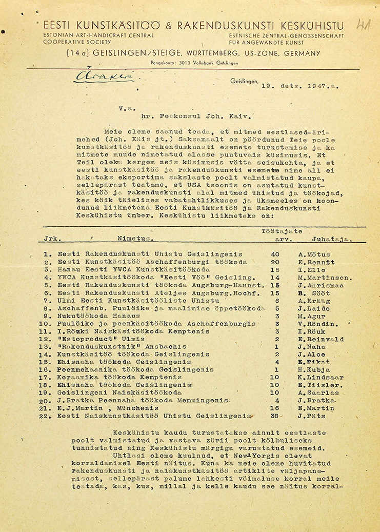 | The representatives of Estonian Art-Handicraft Central Cooperative Society, Mr. Vello Rebane and K. A. Nõmmisto, confirm in a letter addressed to the consul general Mr. Johannes Kaiv their desire to exhibit and market the articles made by the Estonian craftsmen. The letter contains a list of the member organizations of Estonian Art-Handicraft Central Cooperative Society in Germany. ERA.1608.2.950, page 30 (digitized, www.ra.ee/saaga) |