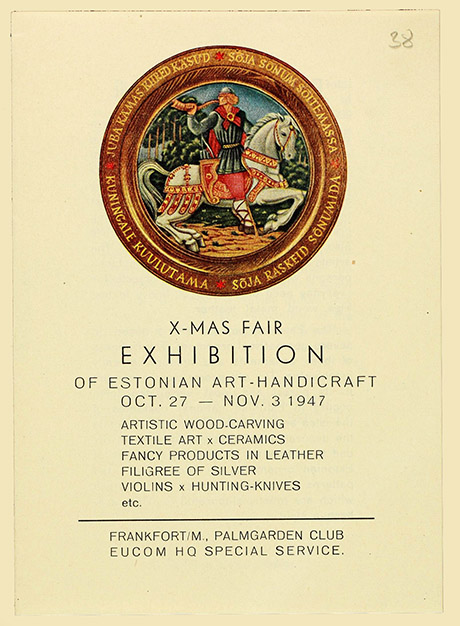 | An advertisement of Estonian art-handicraft Christmas exhibition (October 27 – November 3, 1947, Frankfort, USA). ERA.1608.2.953, page 38 (digitized, www.ra.ee/saaga) |