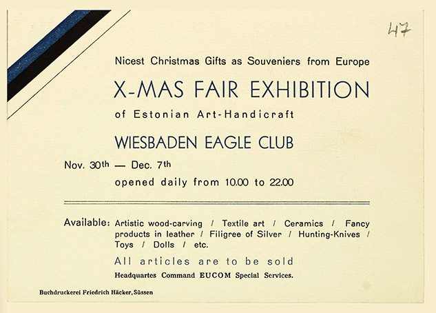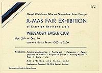 | An advertisement of Estonian art-handicraft Christmas exhibition (November 30 – December 7, 1947, Wiesbaden, USA). ERA.1608.2.953, page 47 (digitized, www.ra.ee/saaga) |