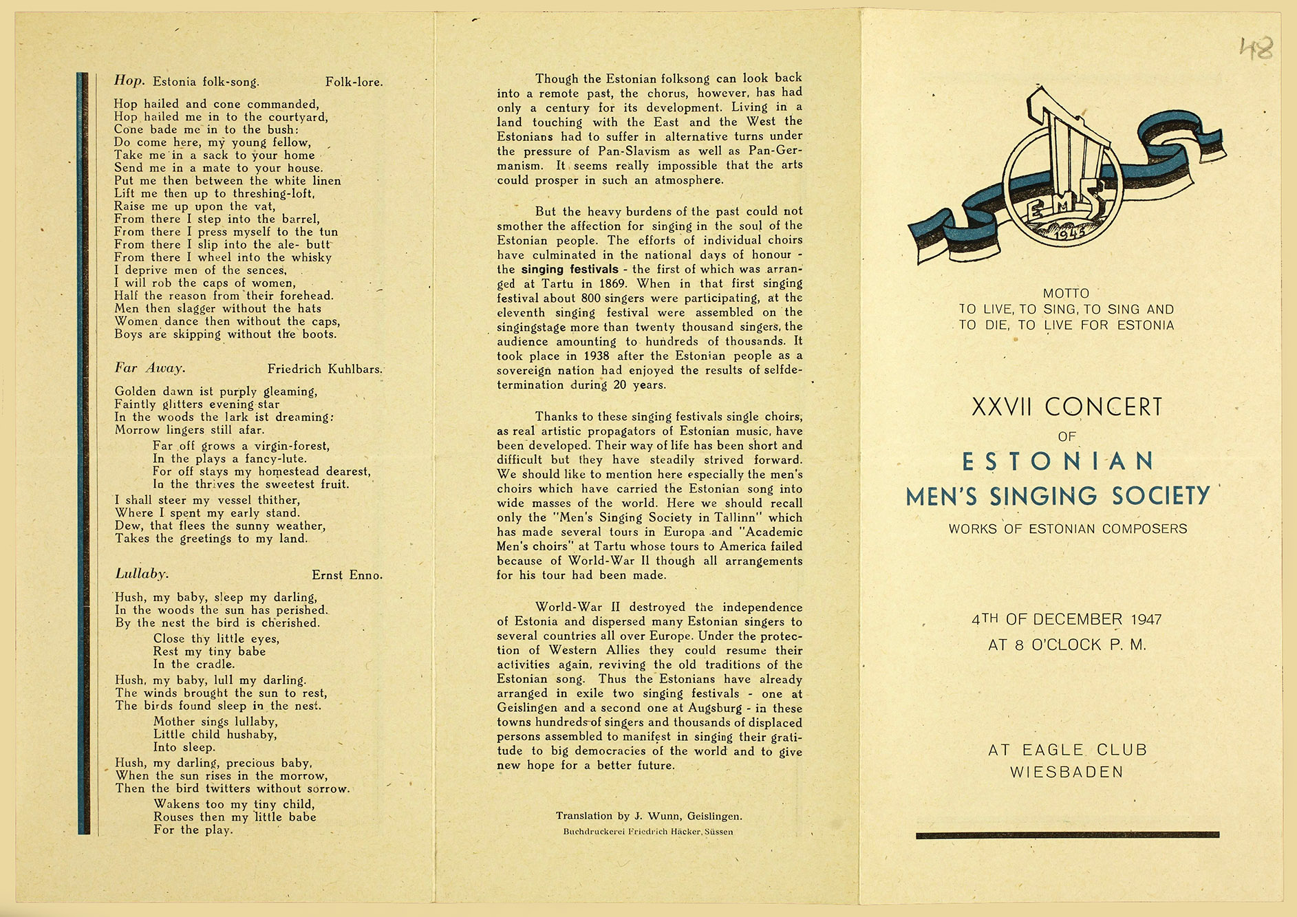 | A program of the 27th concert of Estonian Men's Singing Society. December 4, 1947, Wiesbaden. ERA.1608.2.953, page 48 (digitized, www.ra.ee/saaga) |