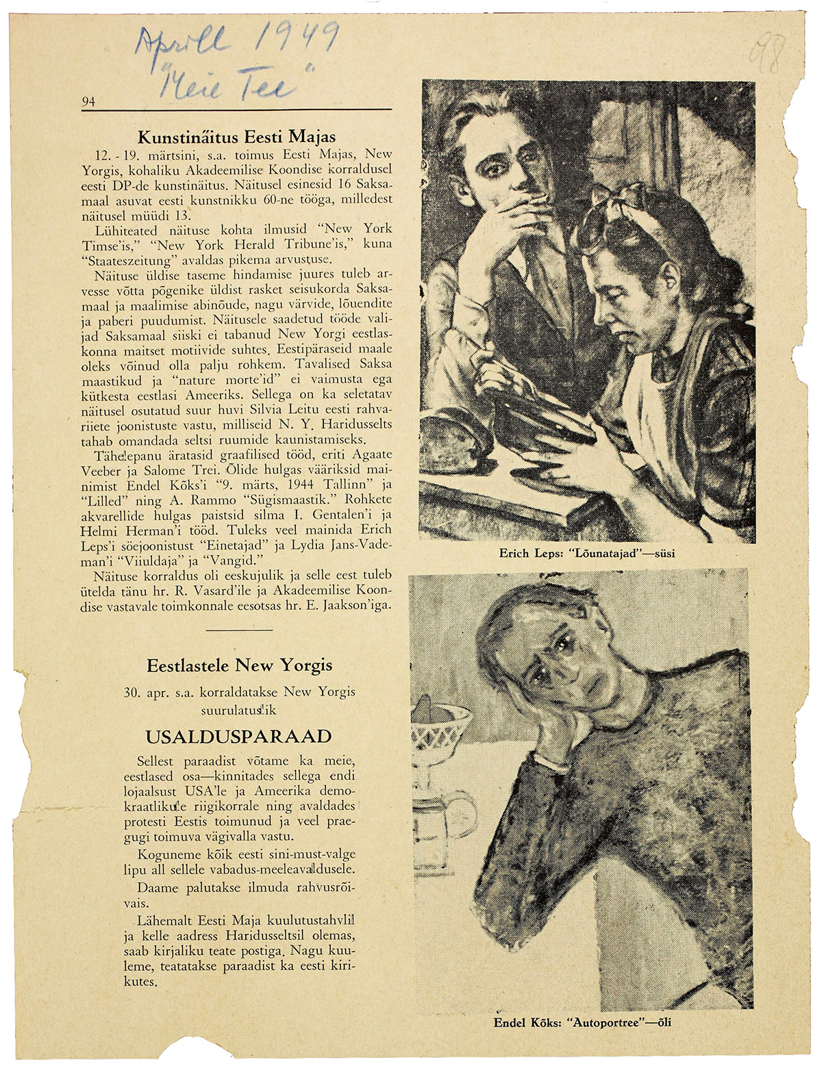 | An overview of the Estonian DPs art exhibition held in New York and published in the newspaper of "Meie Tee" in April, 1949. The exhibition was arranged by an Estonian organization "Akadeemiline Koondis" lead by Ernst Jaakson. On March 12–19, 1949, 16 Estonian artists living in Germany (including Agathe Veeber, Salome Trei, Endel Kõks etc.) were presented their works in Estonian House in New York. ERA.1608.2.954, page 98 (digitized, www.ra.ee/saaga) |