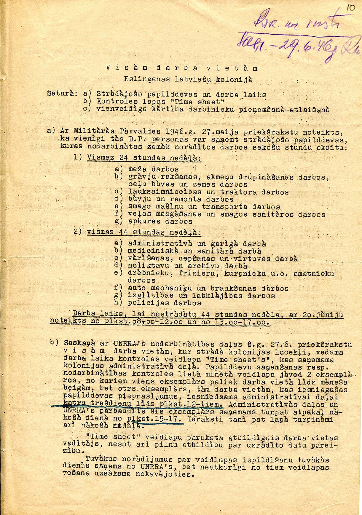 | Employment terms. Esslingen DP camp. 28 June 1946. LVA, 2176. f., 2v. apr., 3. l., 10. lp., 10. op. lp., 11.lp. |