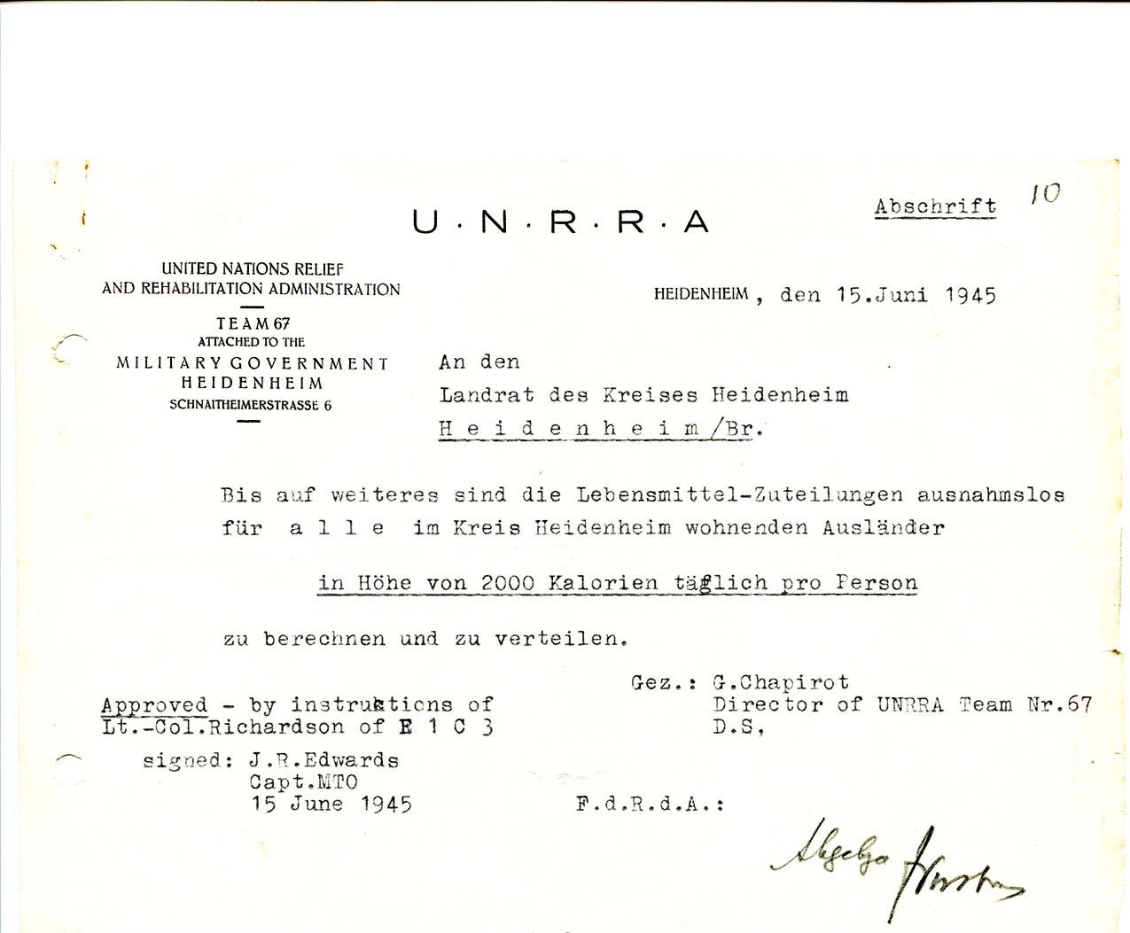 | Circular on daily calorie intake for foreigners living in Heidenheim region. 15 June 1945. LVA, 2176. f., 2v. apr., 7. l., 10. lp. |