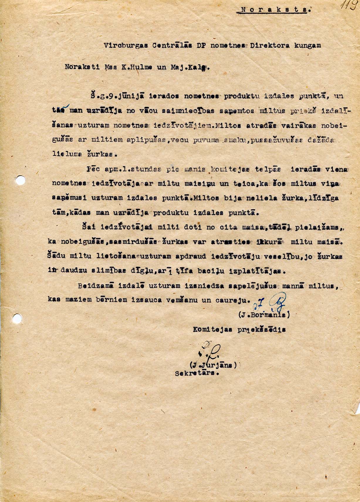 | Report on food quality. LVA, 2335. f., 1. apr., 281. l., 119. lp., LVA, 2176. f., 2v. apr., 102. l., 5. op. lp. |