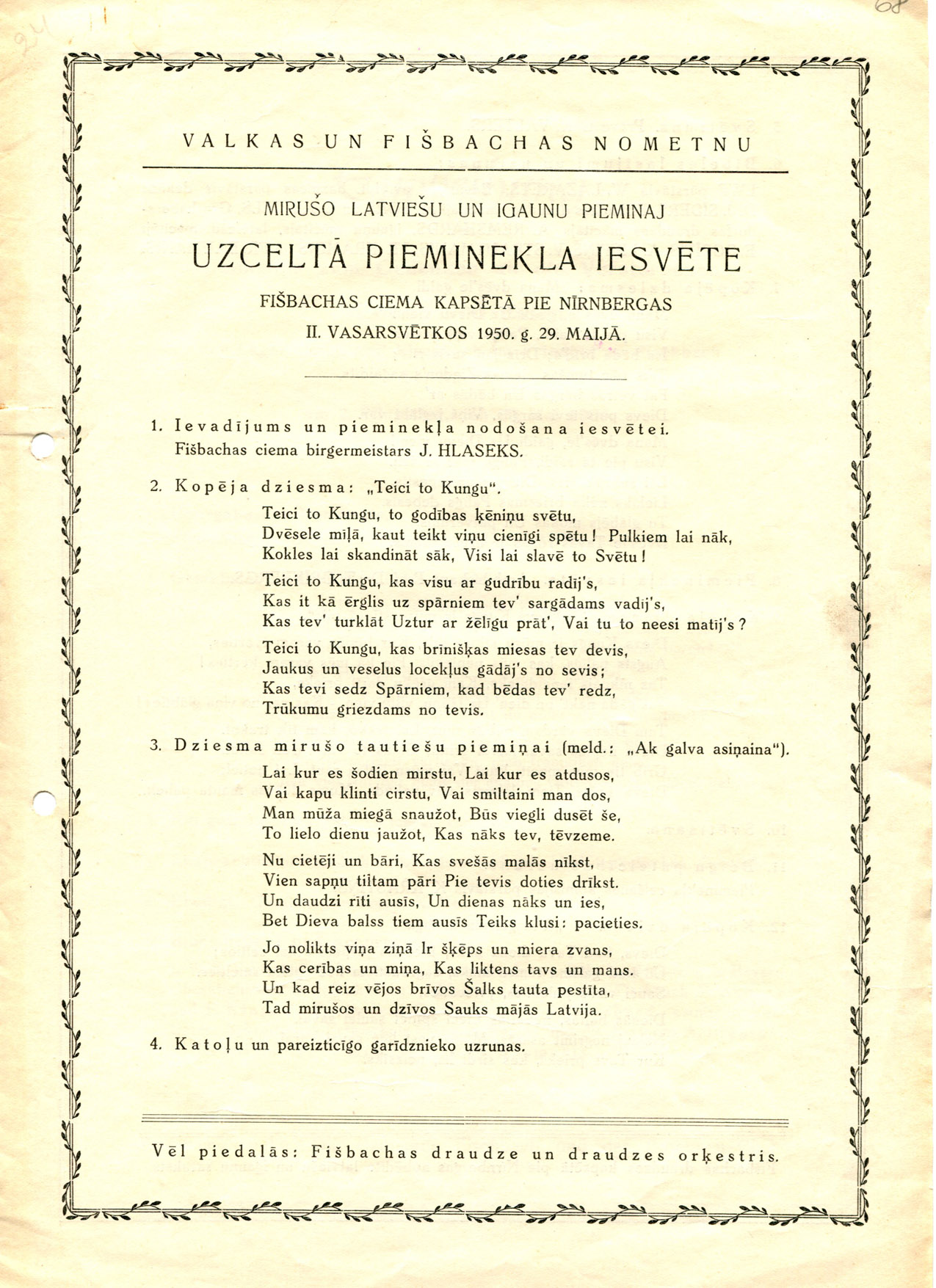 Consecration page of the monument for deceased Latvians and Estonians in Fischbach village near Nürnberg.