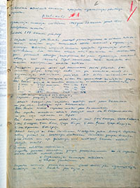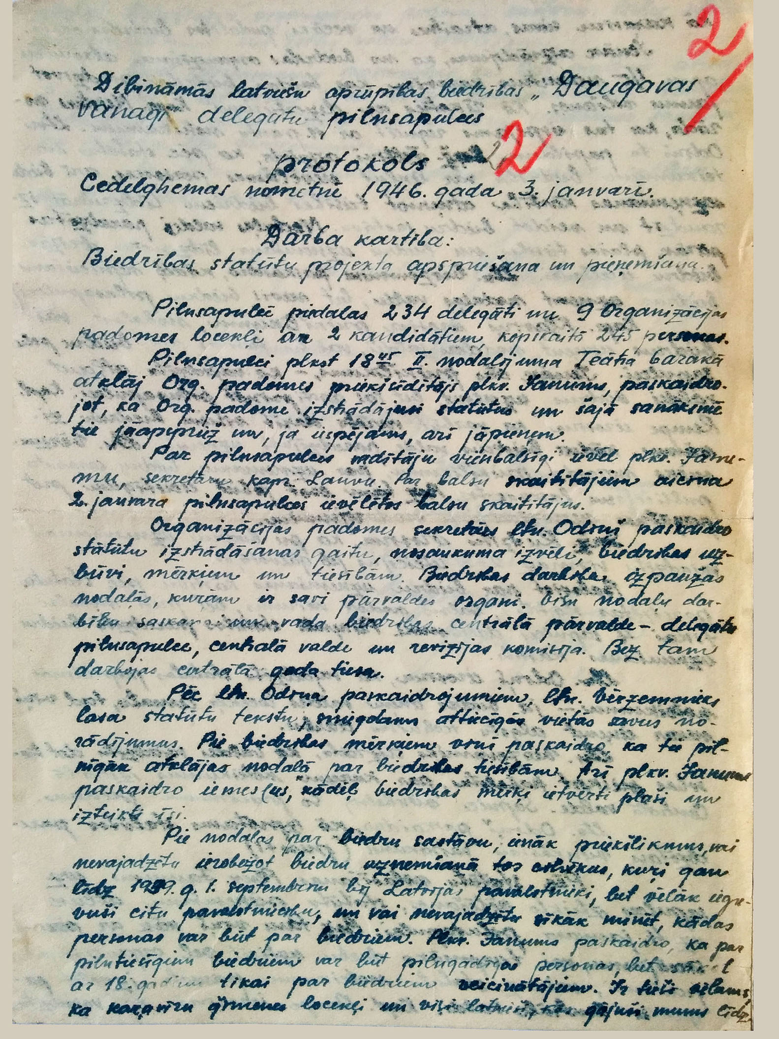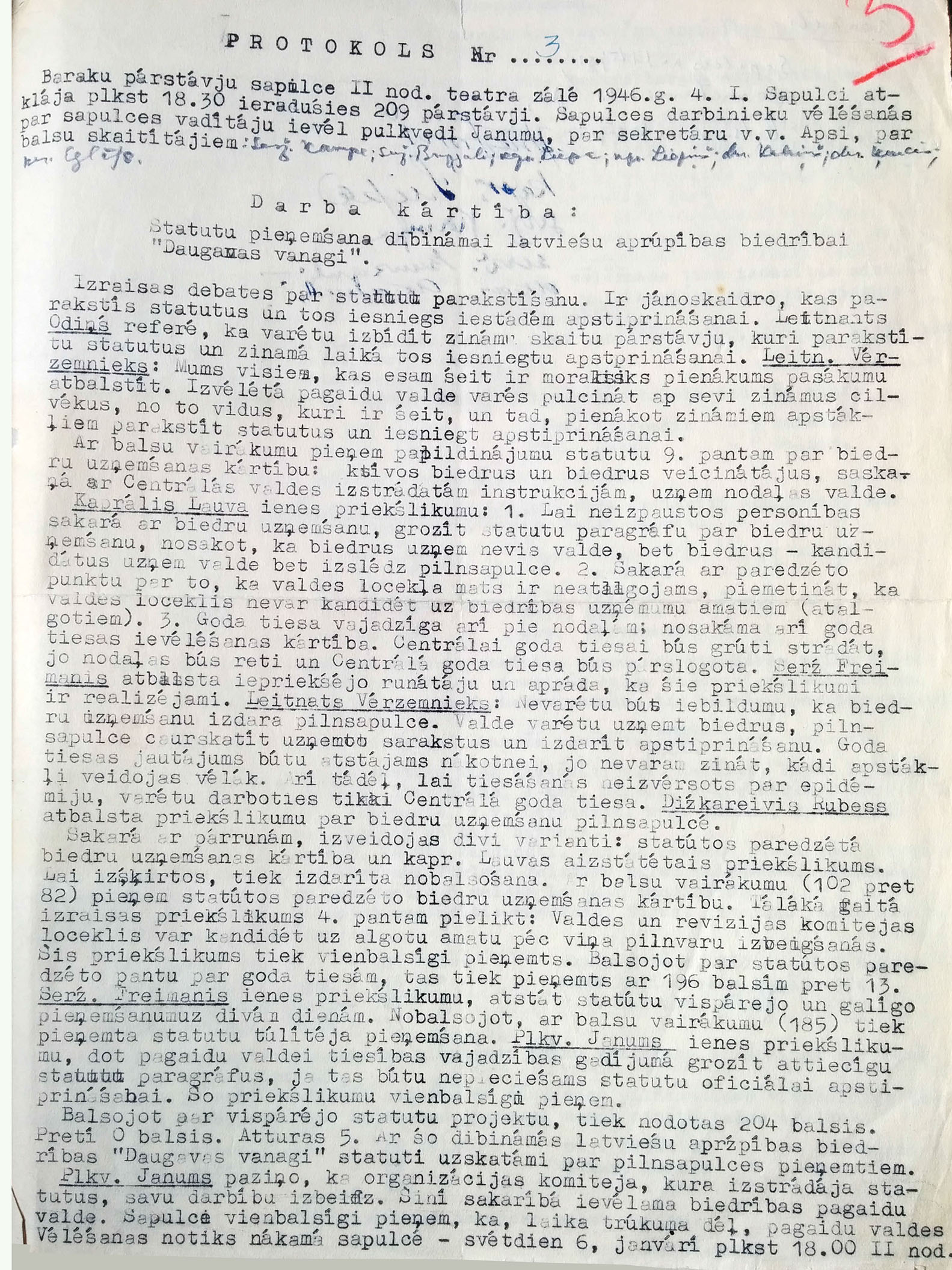 | Dibināmās latviešu aprūpības biedrības "Daugavas Vanagi" delegātu pilnsapulces protokols. 1946. gada 3. janvāris. Latviešu centra "Bērzaine" arhīvs Freiburgā (Vācija). |
