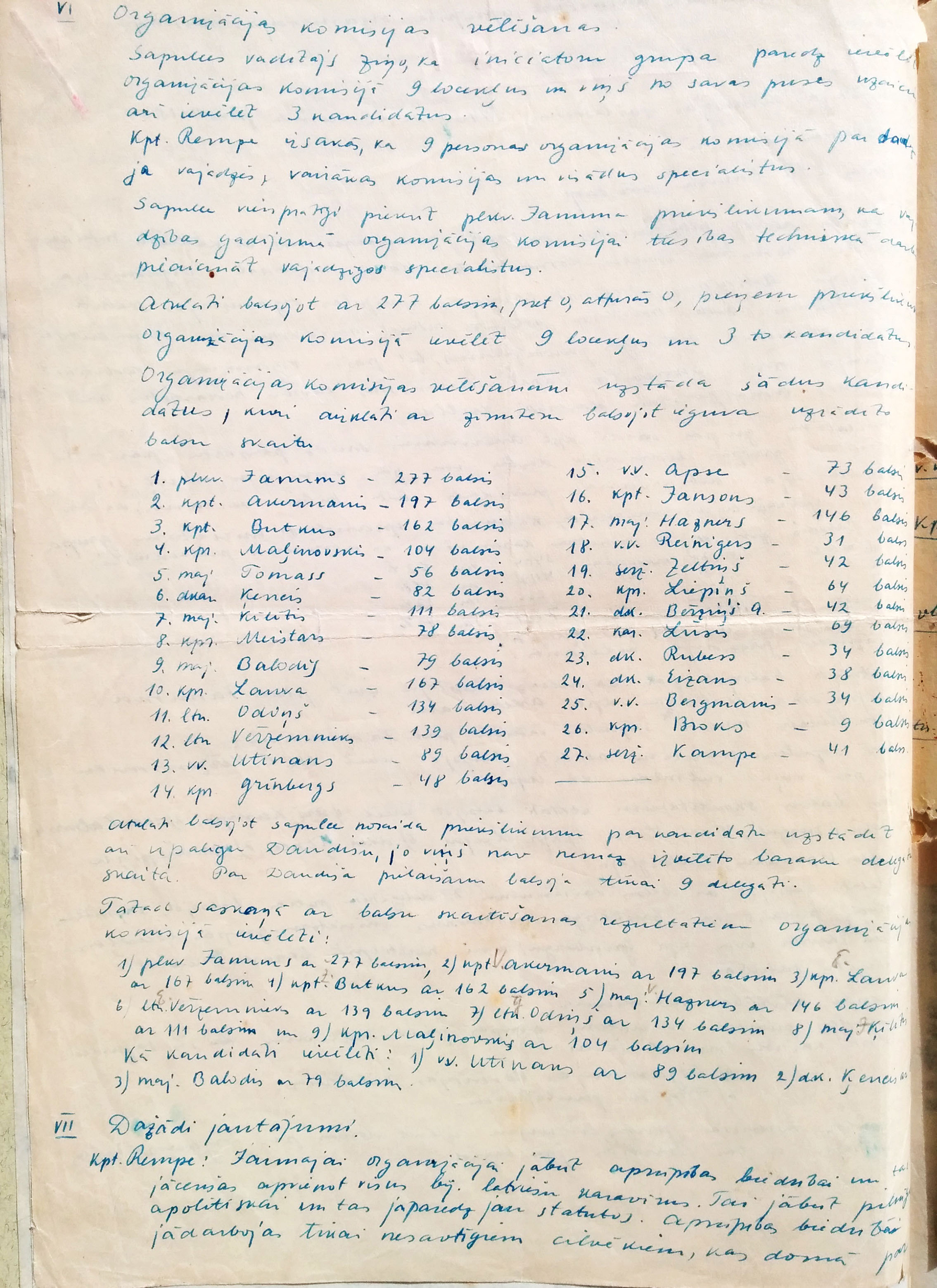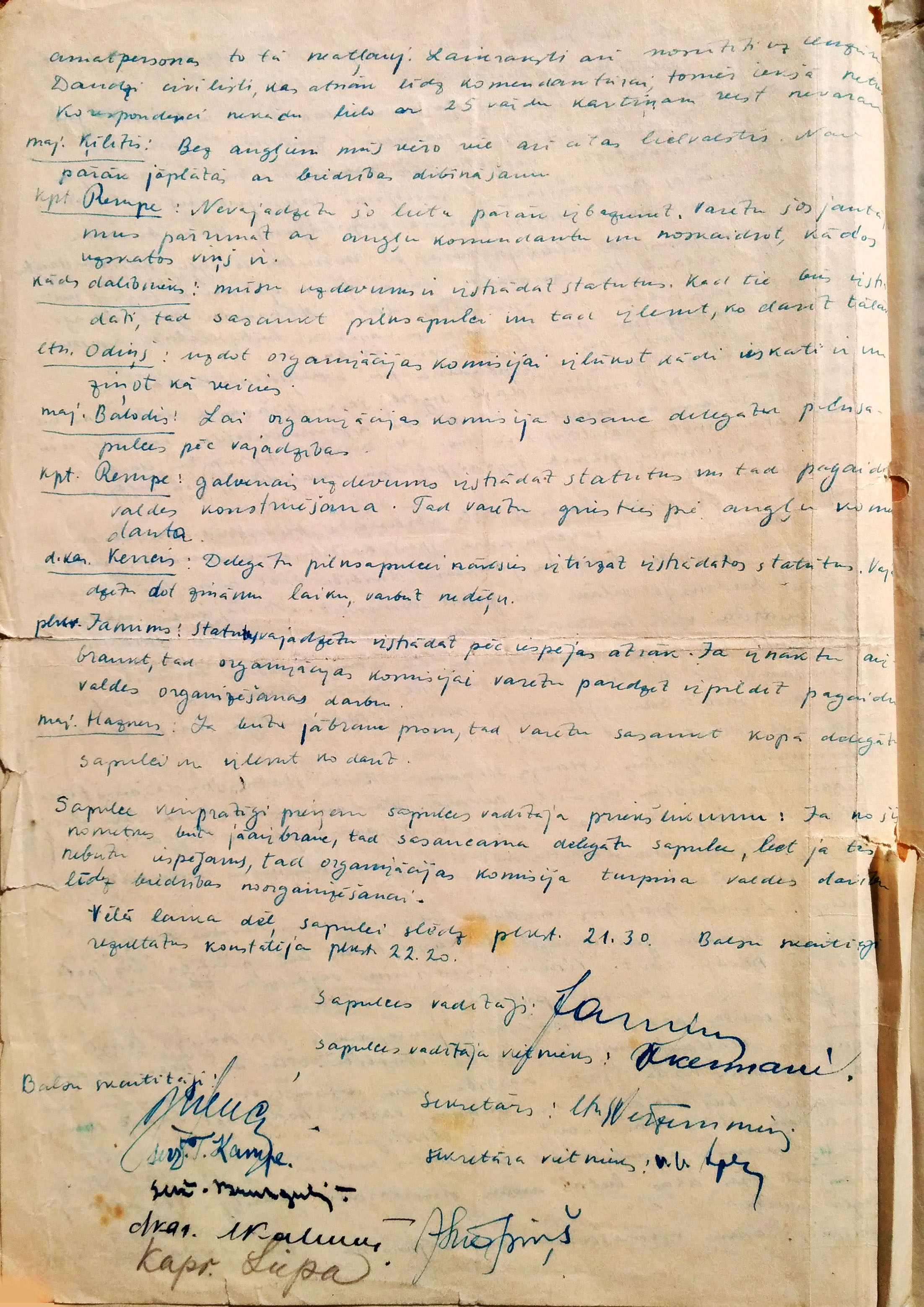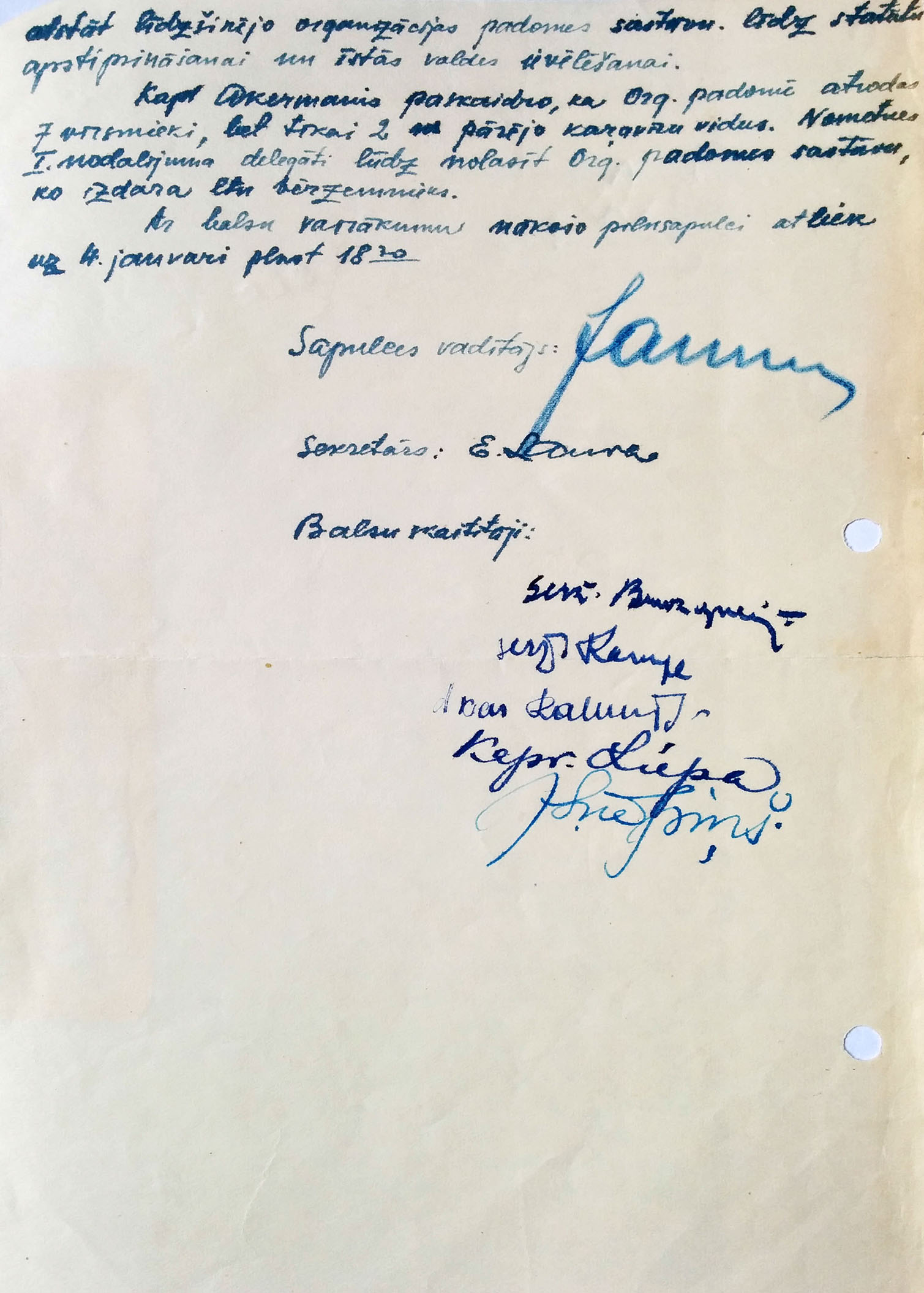 | Dibināmās atvaļināto karavīru aprūpības organizācijas pārstāvju sapulces protokols. 1945. gada 28. decembris. Latviešu centra "Bērzaine" arhīvs Freiburgā (Vācija). |