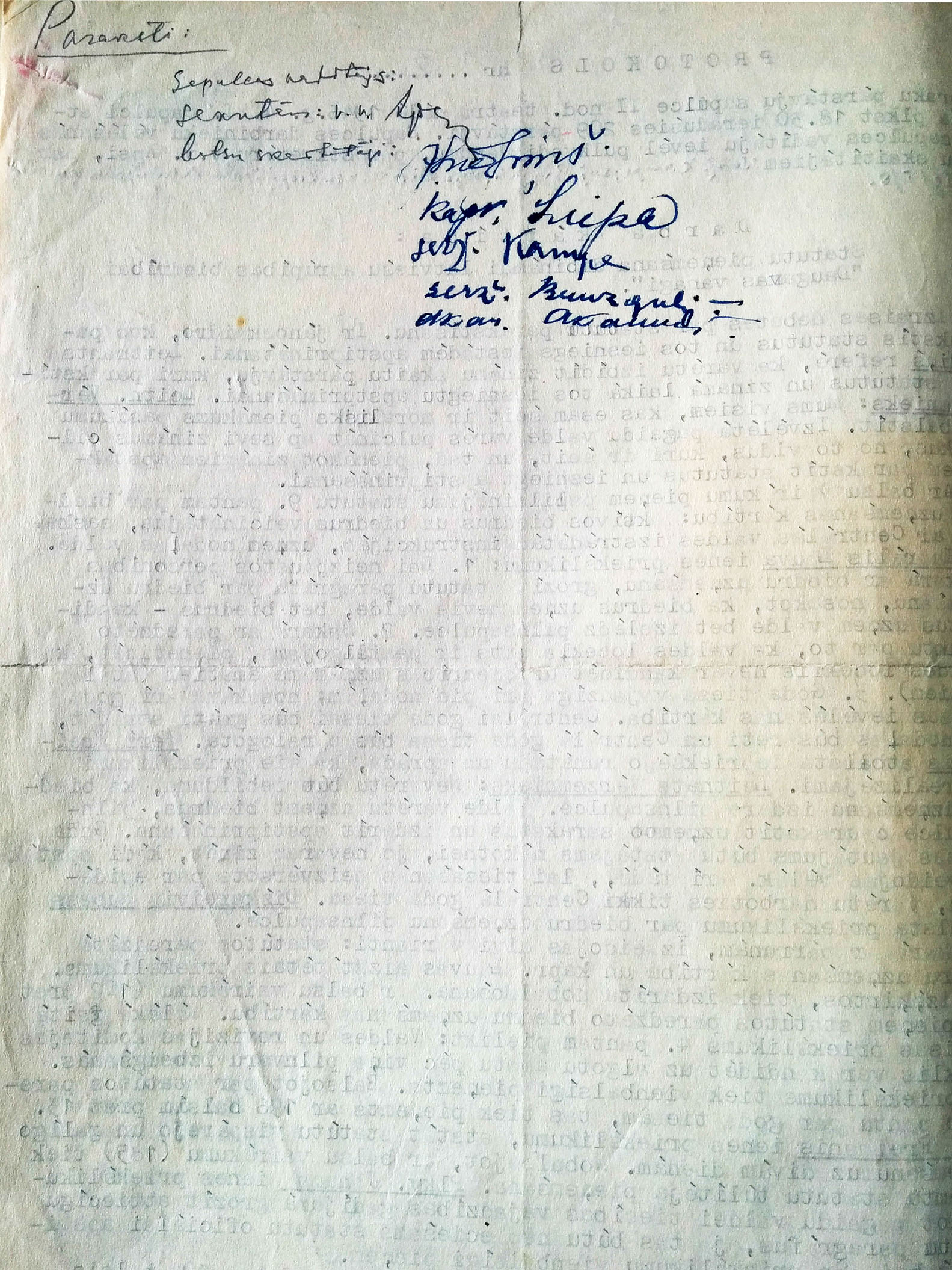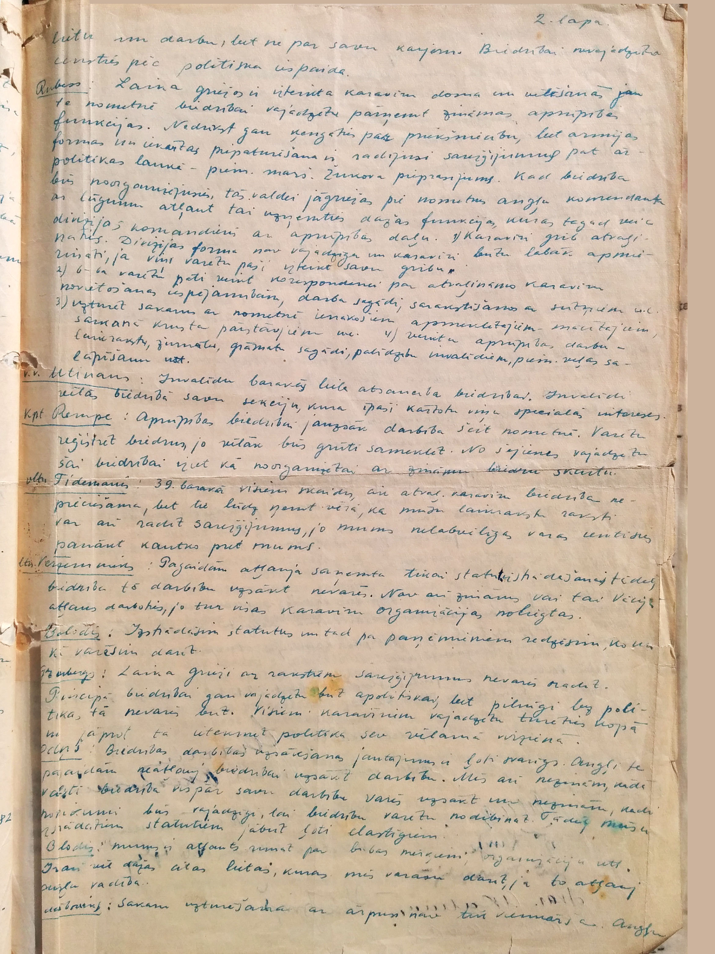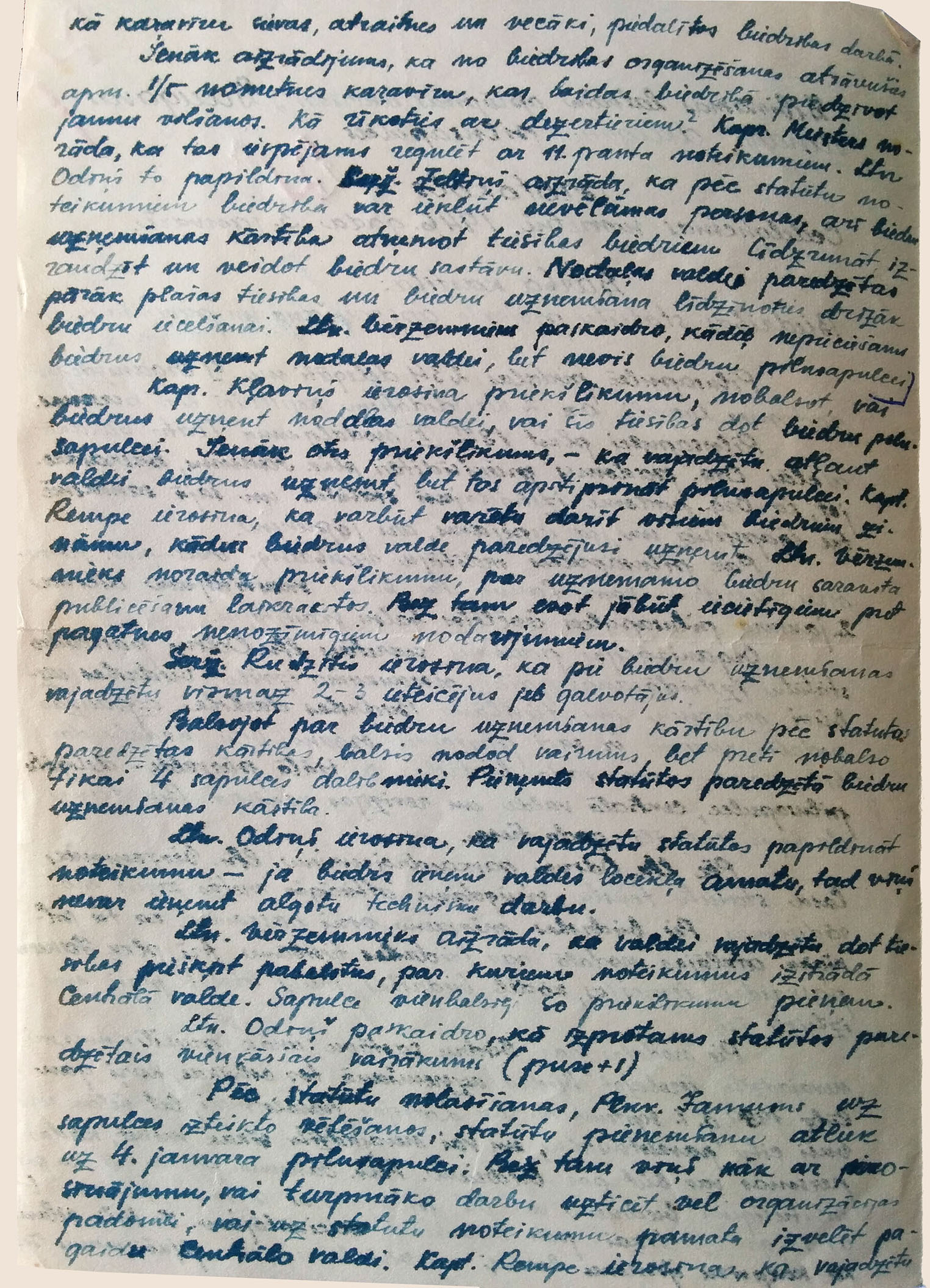 | Dibināmās atvaļināto karavīru aprūpības organizācijas pārstāvju sapulces protokols. 1945. gada 28. decembris. Latviešu centra "Bērzaine" arhīvs Freiburgā (Vācija). |
