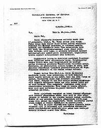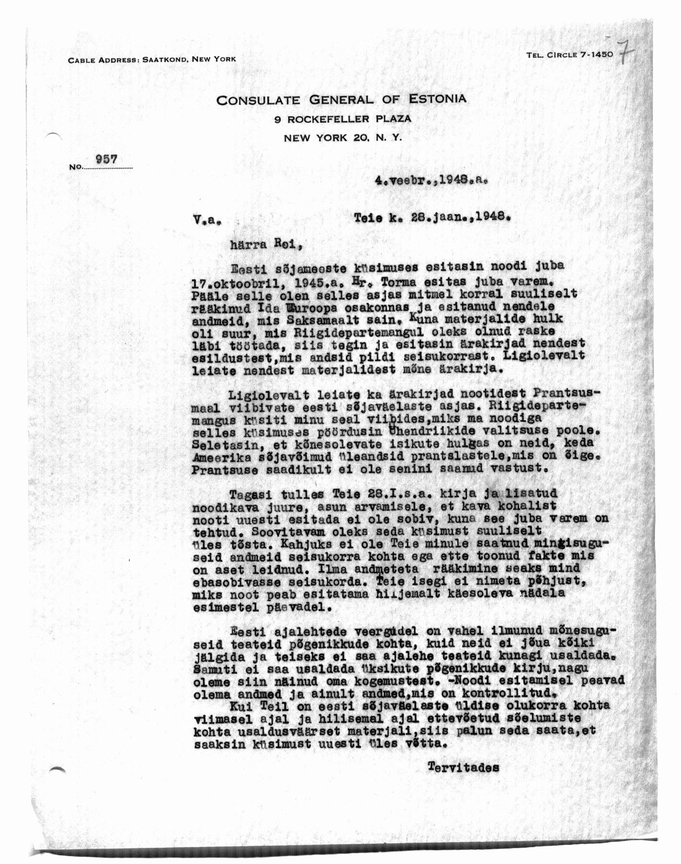 Peakonsul Johannes Kaivu kiri eksiilvalitsuse peaministrile August Reile, kus kirjeldatakse pagulasdiplomaatide samme Saksa armees teeninud Eesti sõjameeste olukorra selgitamiseks. 4. veebruar 1948.