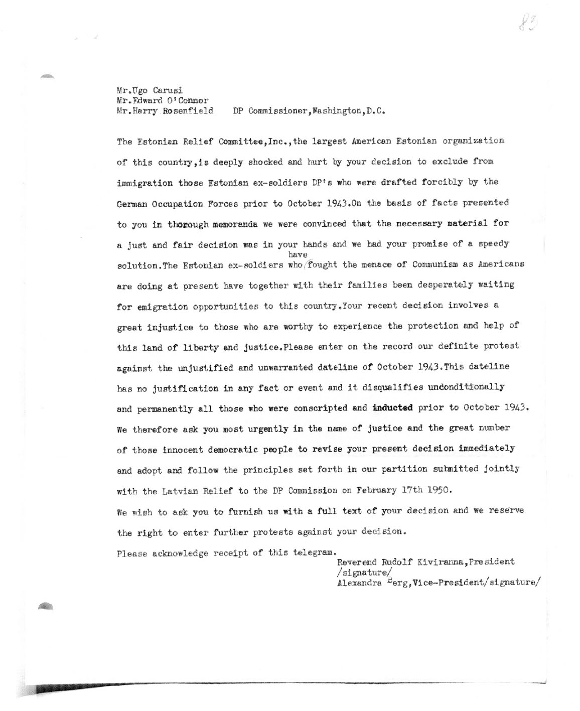 30. augustil 1950 Eesti Abistamise Komitee poolt Ühendriikide pagulaskomisjoni liikmetele Washingtonis saadetud protest endiste eesti sõjameeste piiratud emigratsioonivõimaluste üle.