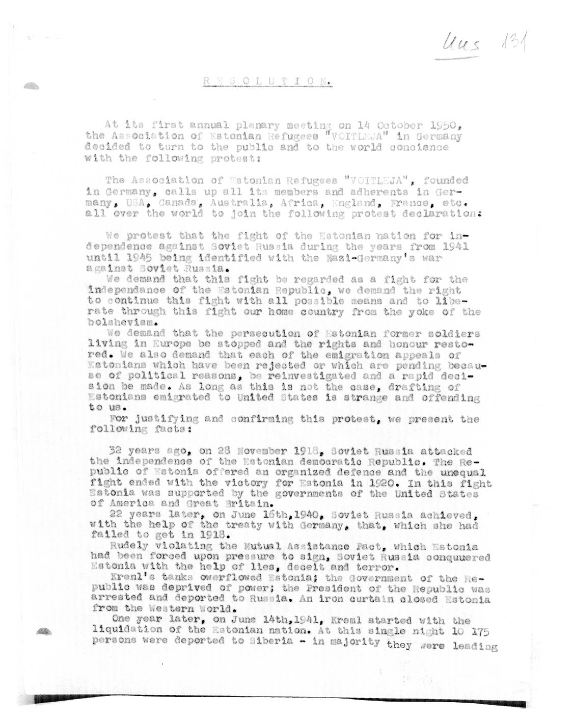Eesti Võitlejate Ühingu Saksamaal 1950. aasta peakoosolekul vastu võetud resolutsioon eesti pagulaste õiguste kaitseks. Resolutsioon saadeti Eesti peakonsulaati New Yorgis selle edasiseks levitamiseks.
