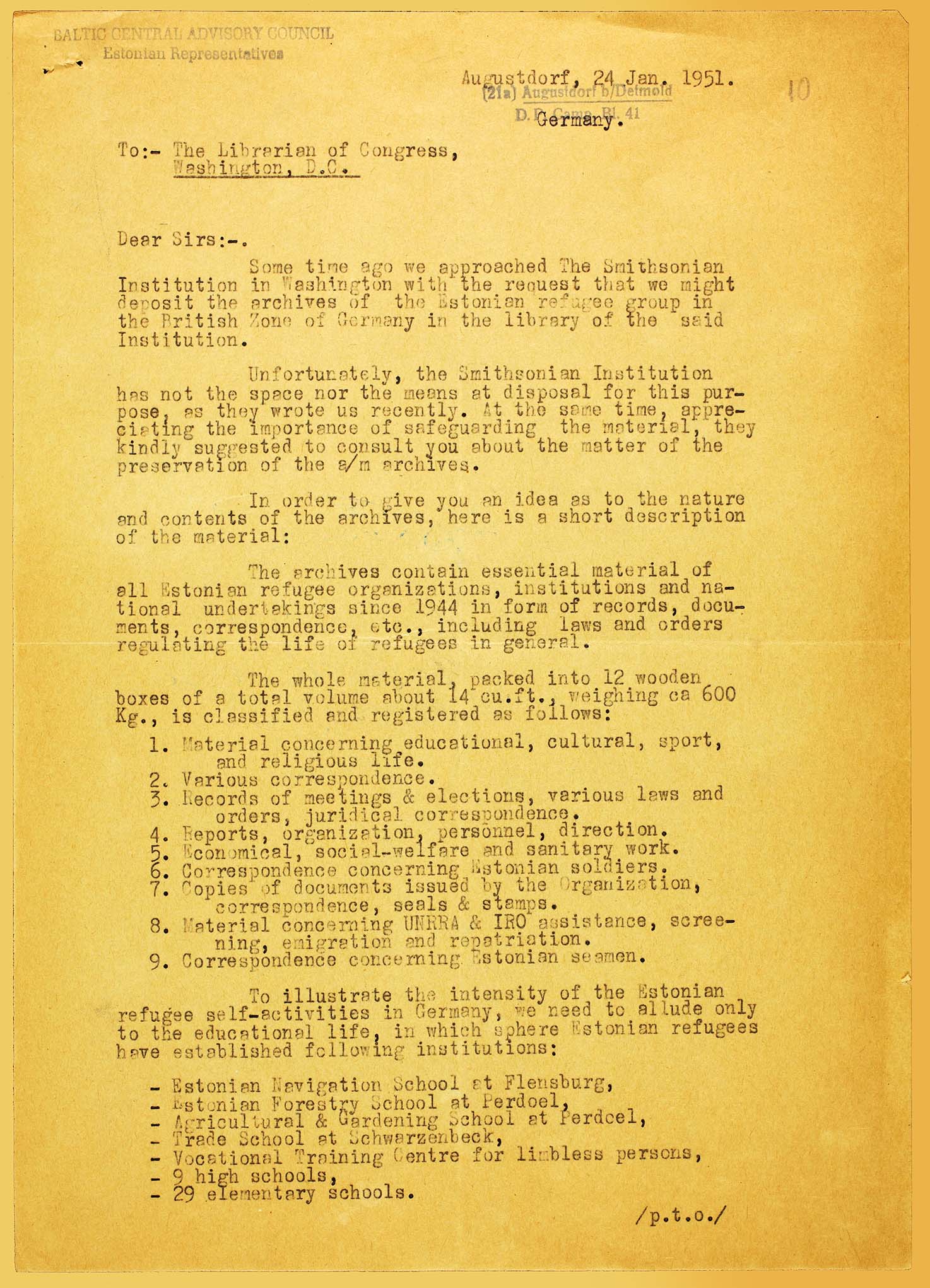 | Estonian representative in the Baltic Central Advisory Council, Mr. Hermann Stockeby turns to the Library of Congress for to acquire a repository situating outside Europe for Estonian archival sources in Germany. The amount of records is noticed as 12 wooden boxes with total weight of 600 kilograms. January 24, 1951. ERA.1608.2.1016, pages 10–11 (digitized, www.ra.ee/saaga) |
