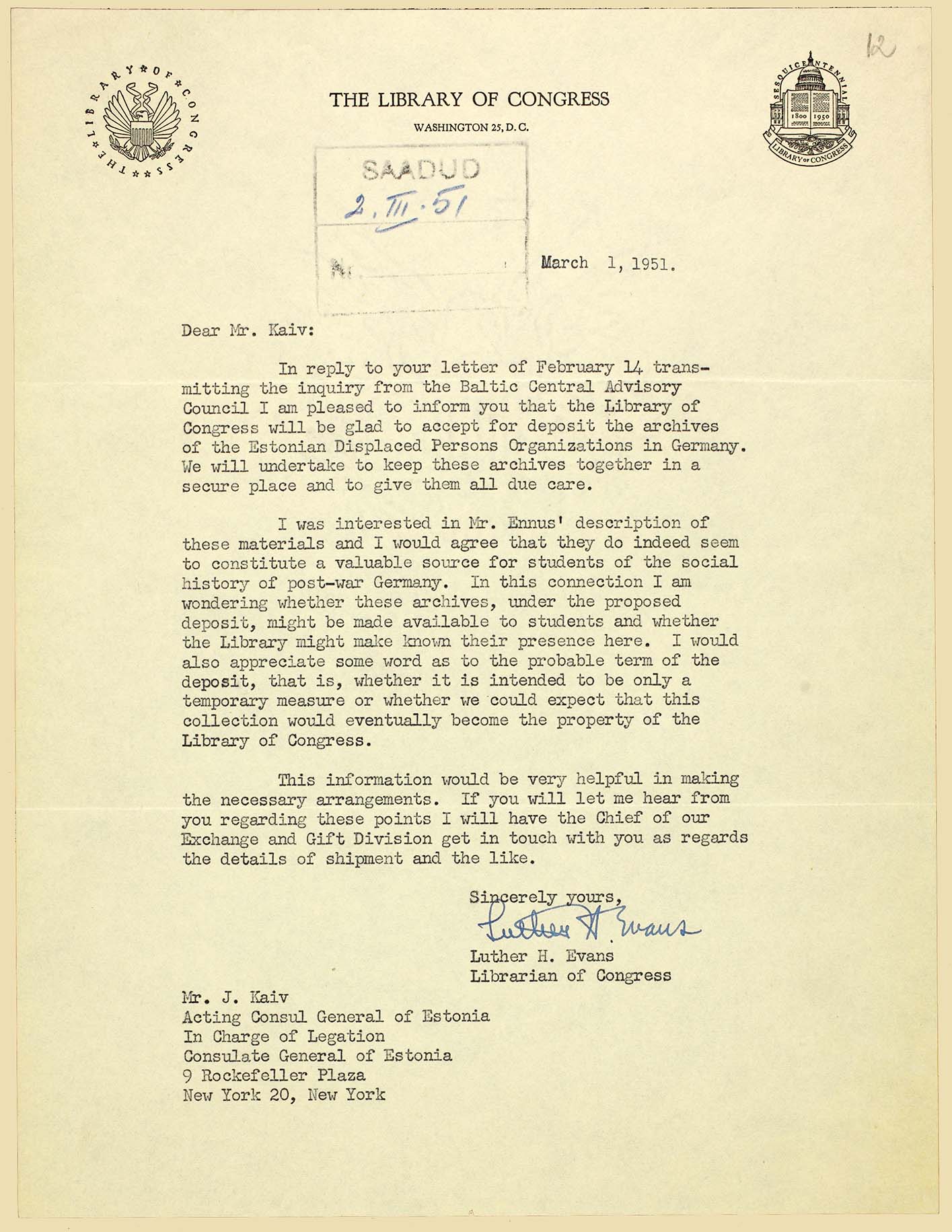 | The Library of Congress confirms to consul general, Mr. J. Kaiv, its willingness to take the archival sources of Estonian Displaced Organizations for a deposit maintenance. ERA.1608.2.1016, page 12 (digitized, www.ra.ee/saaga) |