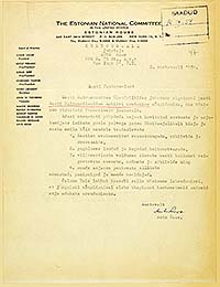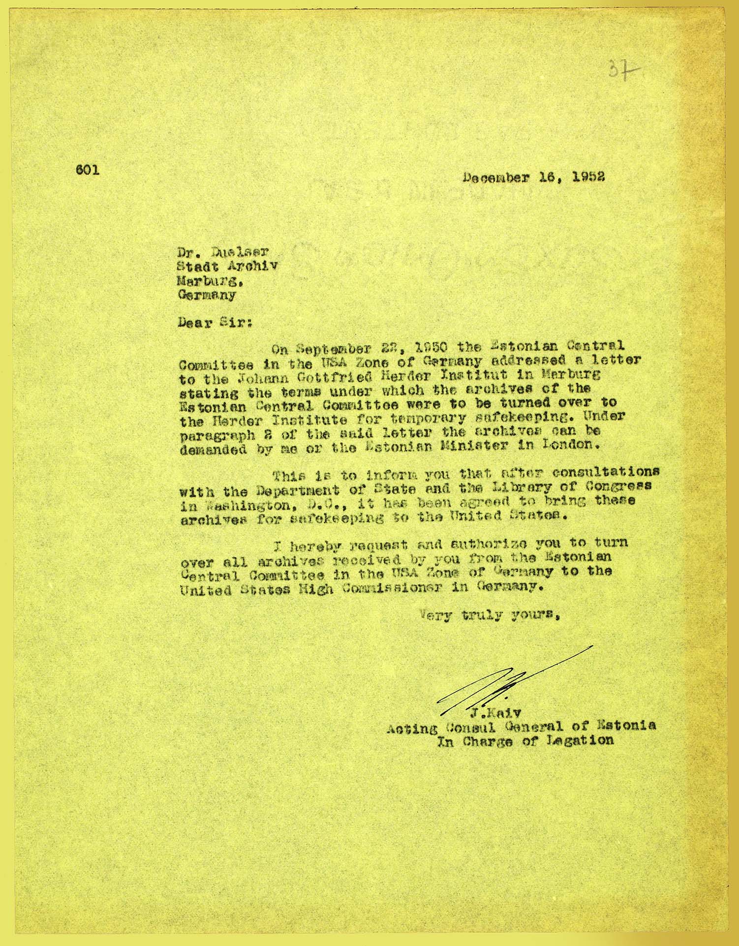 | Estonian consul general, Mr. J. Kaiv, informs Herder Institute, there were kept the archives of Estonian Displaced Organizations in Germany, that the archives will be tranferred to the Library of Congress. ERA.1608.2.1016, page 37 (digitized, www.ra.ee/saaga) |
