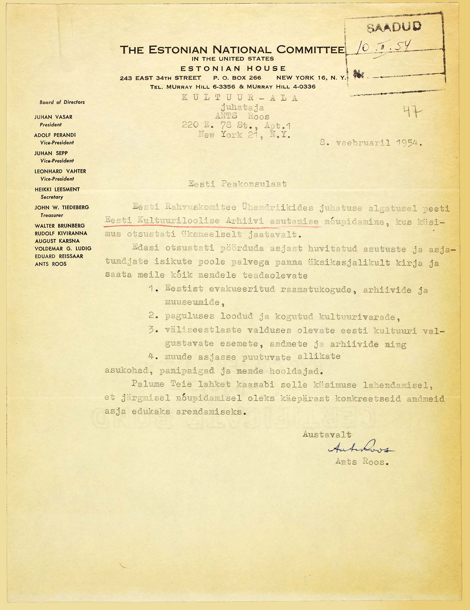 | Board of directors of the Estonian National Committee in the United States decided to found Estonian Cultural Archives on February 8, 1954. Every interested person and organization is asked to send there information about libraries, archives and museums founded abroad or evacuated from Estonia, or concerning Estonian culture in general. ERA.1608.2.1016, page 47 (digitized, www.ra.ee/saaga) |