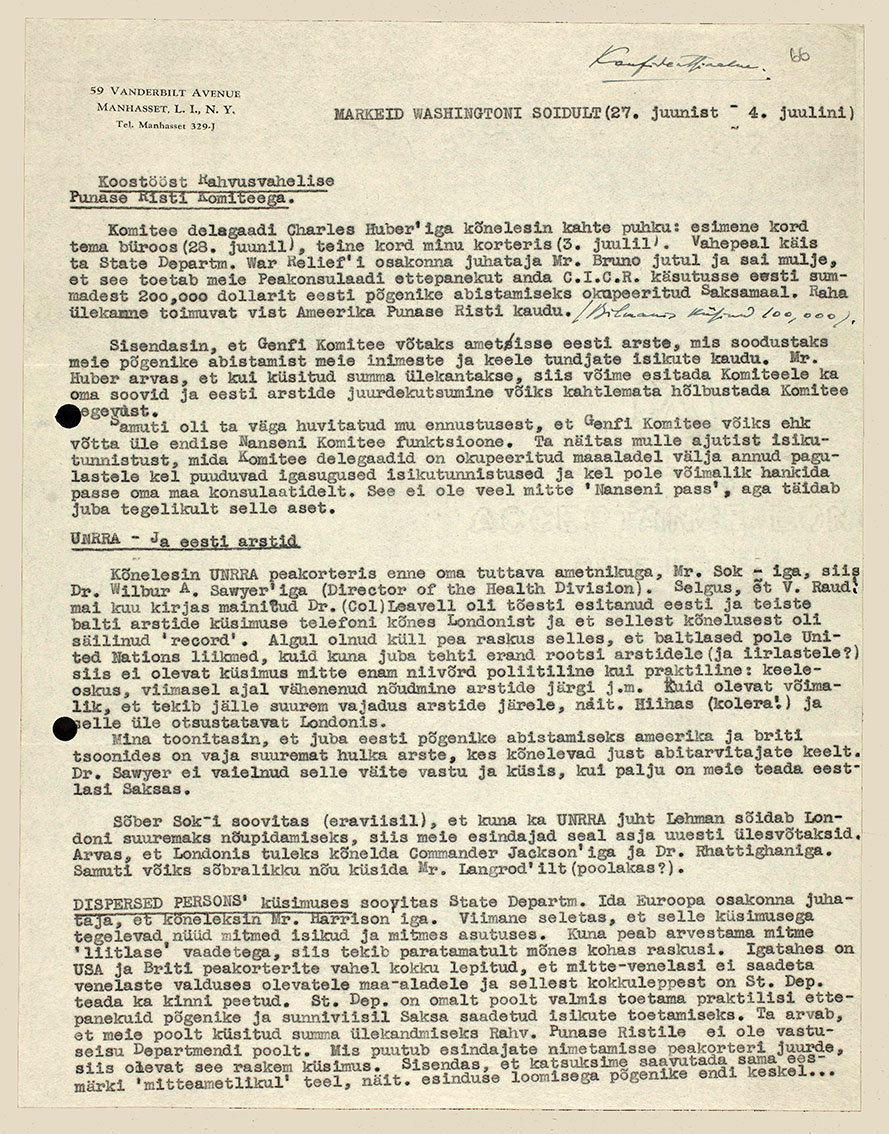 | Karl Robert Pusta märkmed Punase Risti kohta käigust Washingtoni 27. juunist 4. juulini 1945. ERA.1583.2.25, lk 66–67 (digiteeritud, www.ra.ee/saaga) |