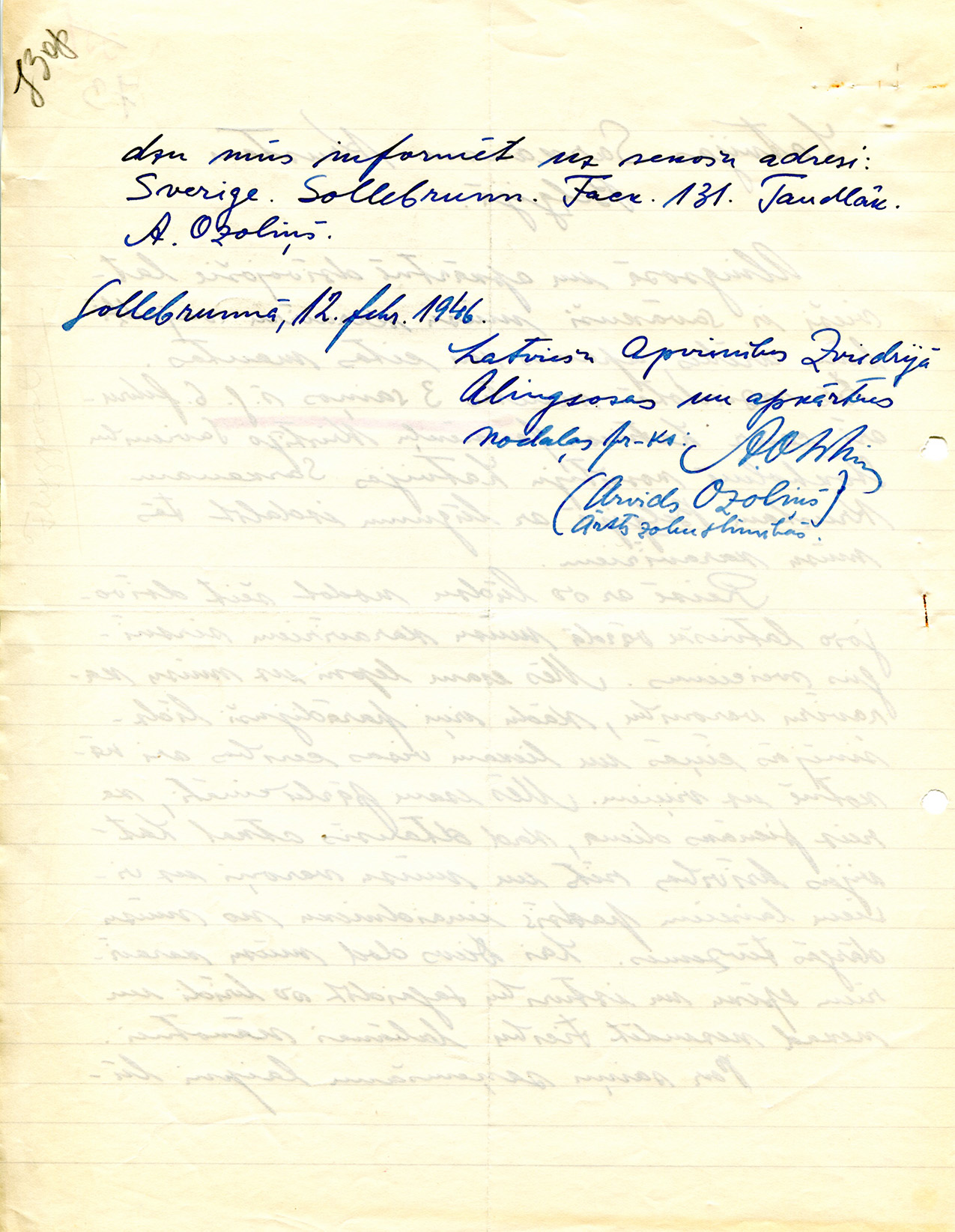 | Latviešu apvienības Zviedrijā vēstule Latvijas Sarkanajam krustam Beļģijā. 1946. gada 12. februāris. LVA, 2176. f., 2v. apr., 206. l., 73., 73. o.p. lp. |