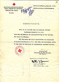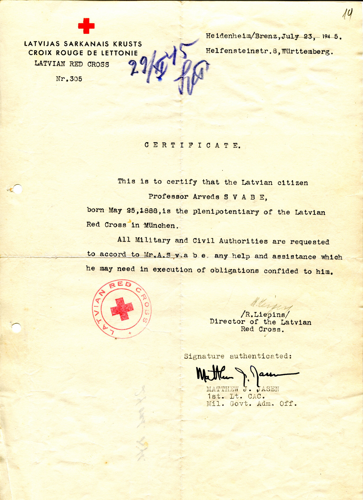 | Latvijas Sarkanā krusta pilnvara Arvedam Švābem. 1945. gada 23. jūlijs. LVA, 2176. f., 2v. apr., 274. l., 14. lp. |
