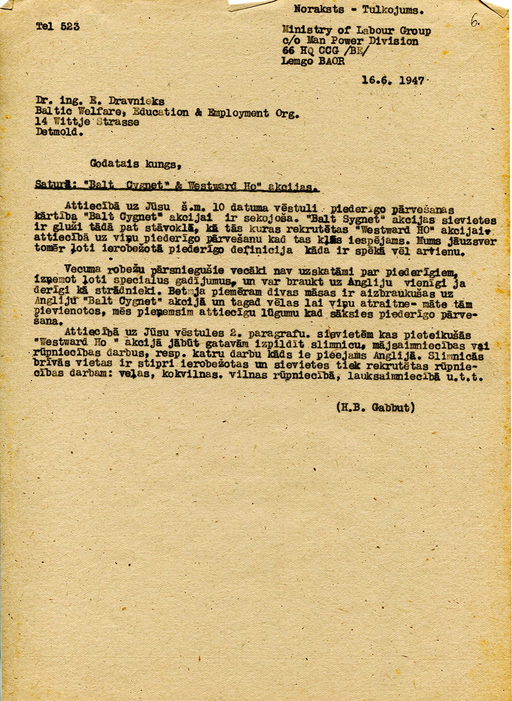 | Noraksts-tulkojums vēstulei par "Balt Cygnet" un "Westward Ho" akcijām. 1947. gada 16. jūnijs. LVA, 1971. f., 1. apr., 24. l., 6. lp. |
