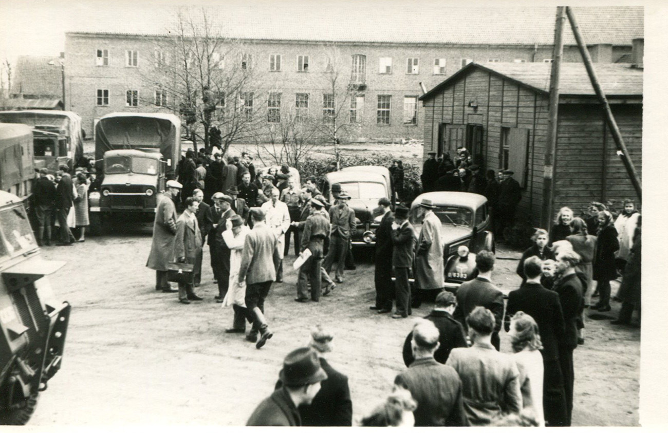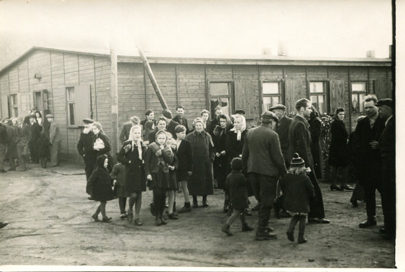 | Latvijas bēgļi no DP nometnes "Tērvete" dodas darbā uz Angliju. Oldenburga, 1947. gada aprīlis. LVA, 2250. f., 25v. apr., 1. l., 8. lp. |
