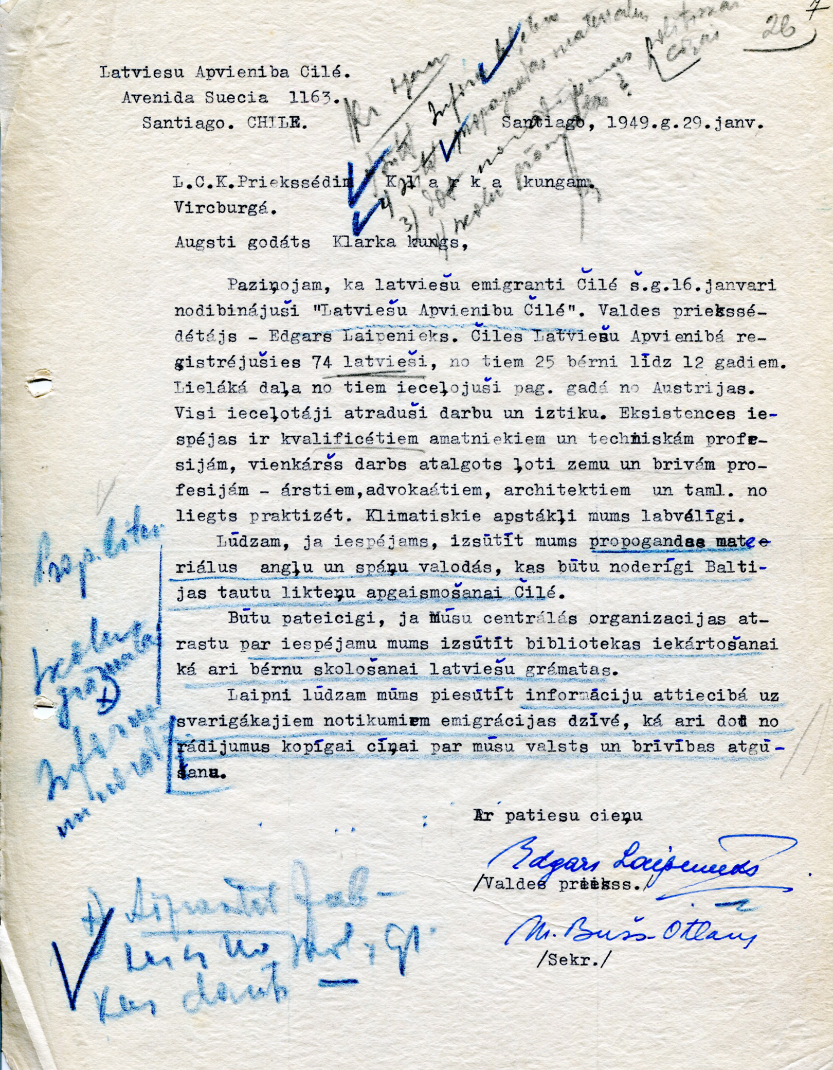 | Latviešu apvienības Čīlē valdes priekšsēža vēstule Latviešu Centrālās komitejas priekšsēdim. 1949. gada 29. janvāris. LVA, 2335. f., 1. apr., 221. l., 7. lp. |