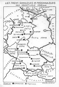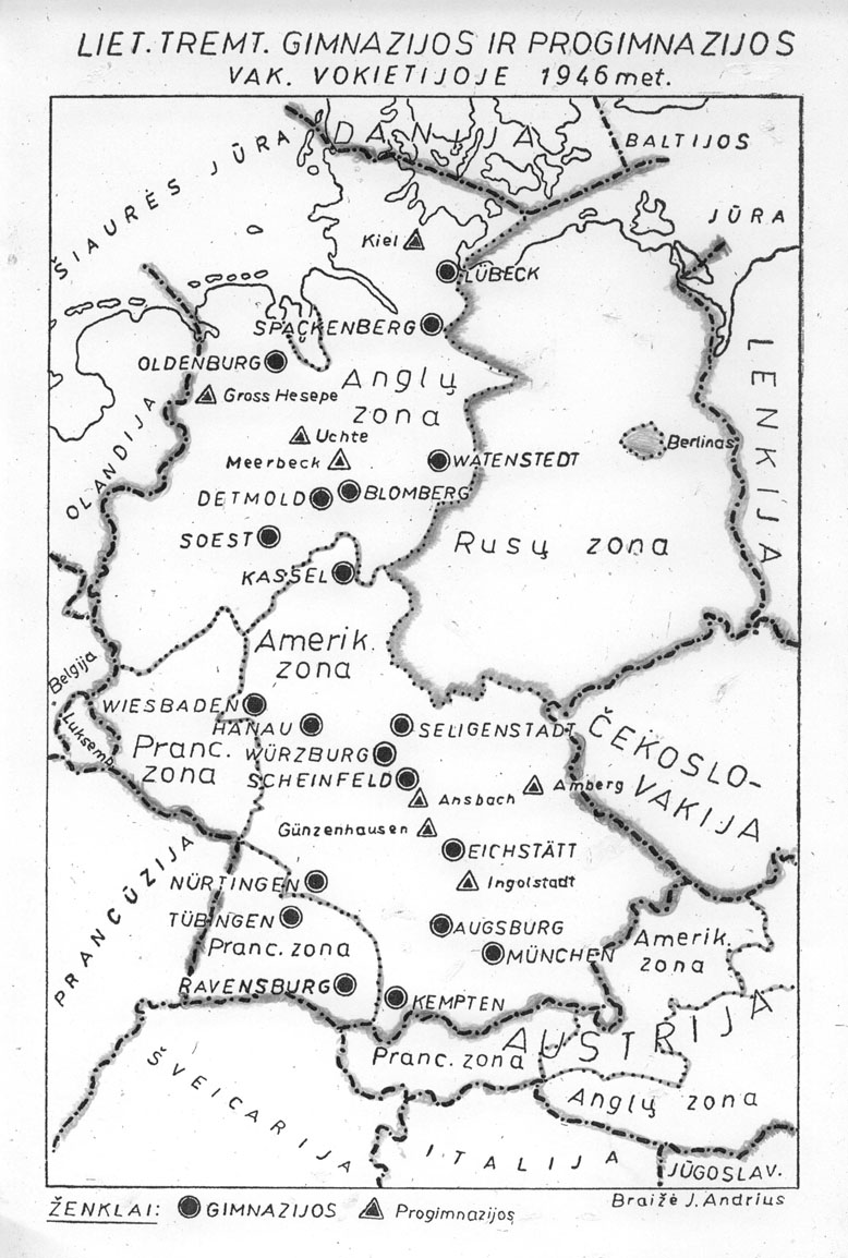 | Lietuvių tremtinių gimnazijų ir progimnazijų Vokietijoje žemėlapis, 1946 m., LKI |