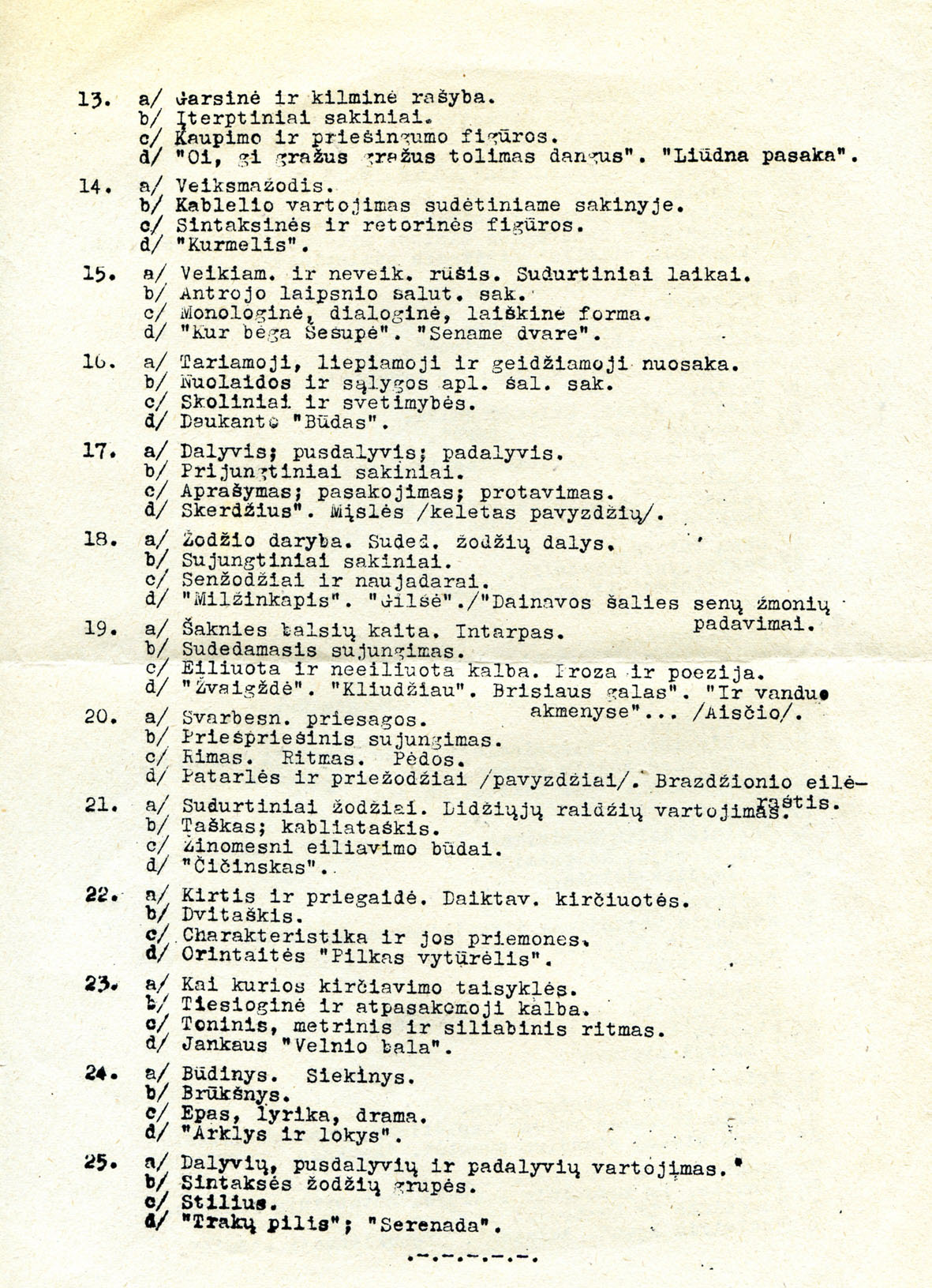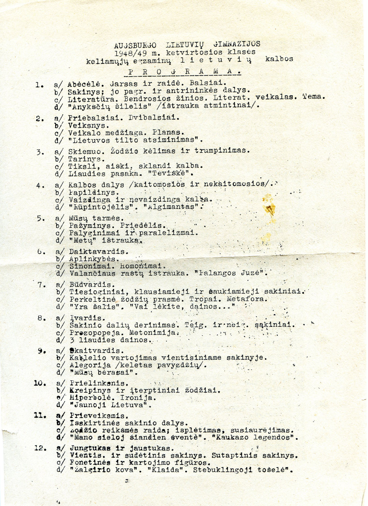 | Augsburgo lietuvių gimnazijos 1948/49 mokslo metų keliamųjų egzaminų lietuvių kalbos programa, LNB RKRS F179:220 |