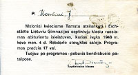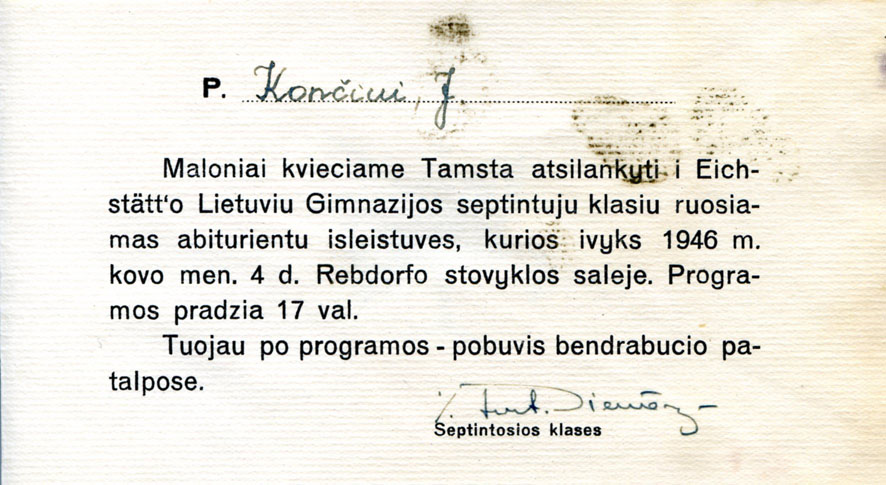 | Kvietimas į Eichšteto lietuvių gimnazijos abiturientų išleistuves 1946 m., LNB RKRS F28:139 |