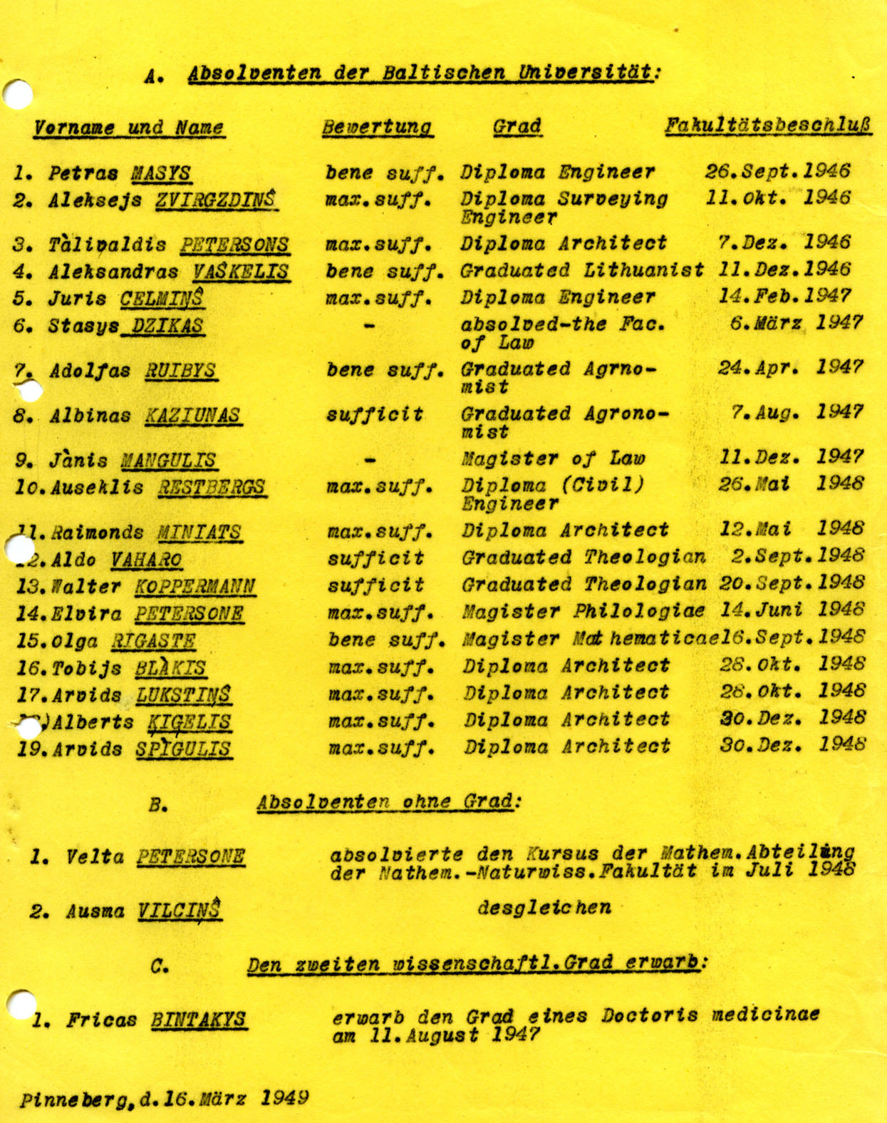 | Pabaltijo universiteto absolventai, Pinebergas, 1949 m. kovo 16 d., LNB RKRS F52:307L |