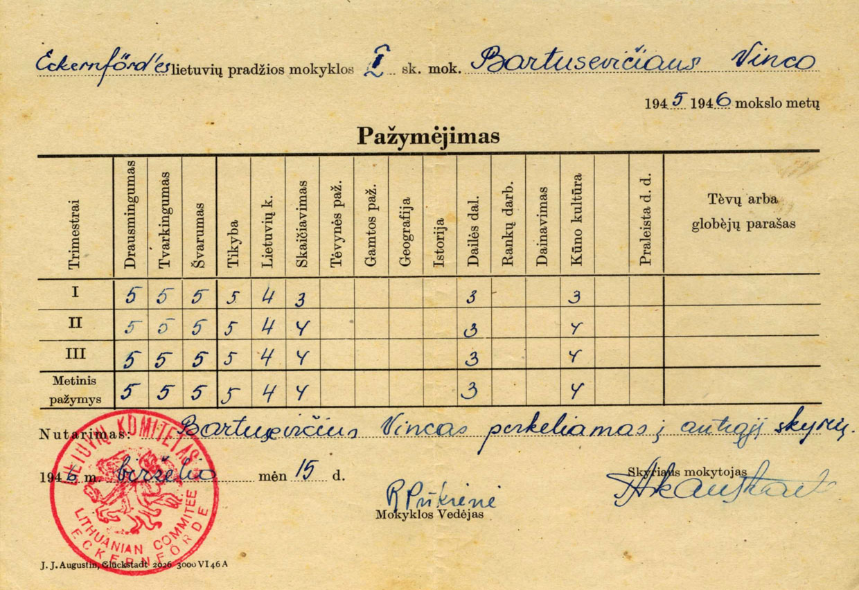 | Ekernferdės pradžios mokyklos mokinio Vinco Bartusevičiaus I skyriaus baigimo pažymėjimas, 1945/1946 m.m., iš asmeninio V. Bartusevičiaus archyvo |