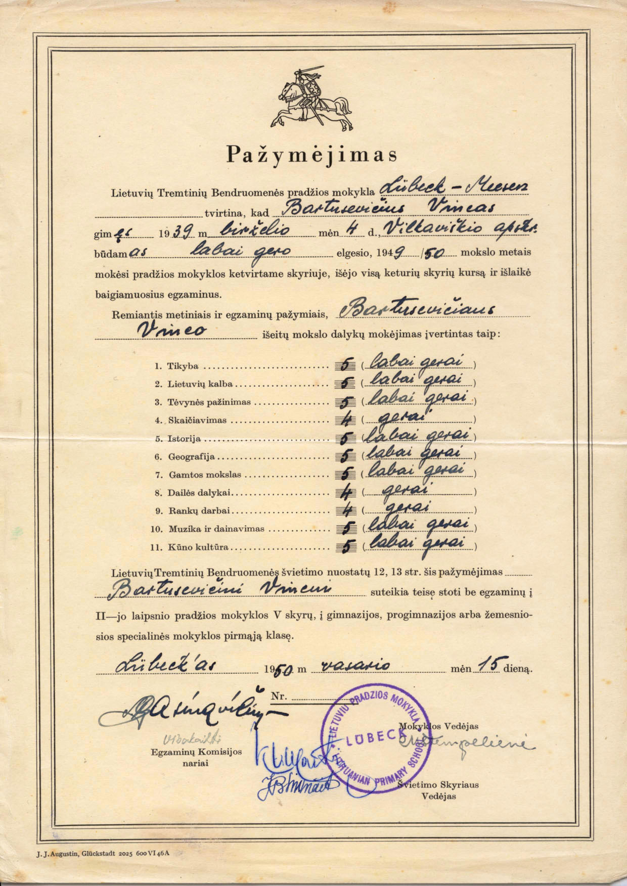 | Liubeko pradinės mokyklos baigimo pažymėjimas, iš asmeninio V. Bartusevičiaus archyvo |