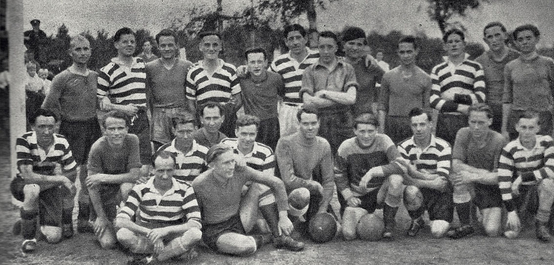 Zedorfo lietuvių DP stovyklos futbolo žaidėjai po rungtynių su britų kareiviais,