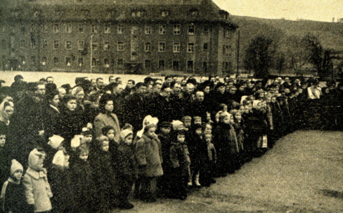| Viurcburgo lietuvių DP bendruomenė Vasario 16-osios minėjime 1946 m. Svetimoj padangėj: Würzburgo lietuvių stovyklos metraštis, 1946, LNB A(LKA) 118/946 |