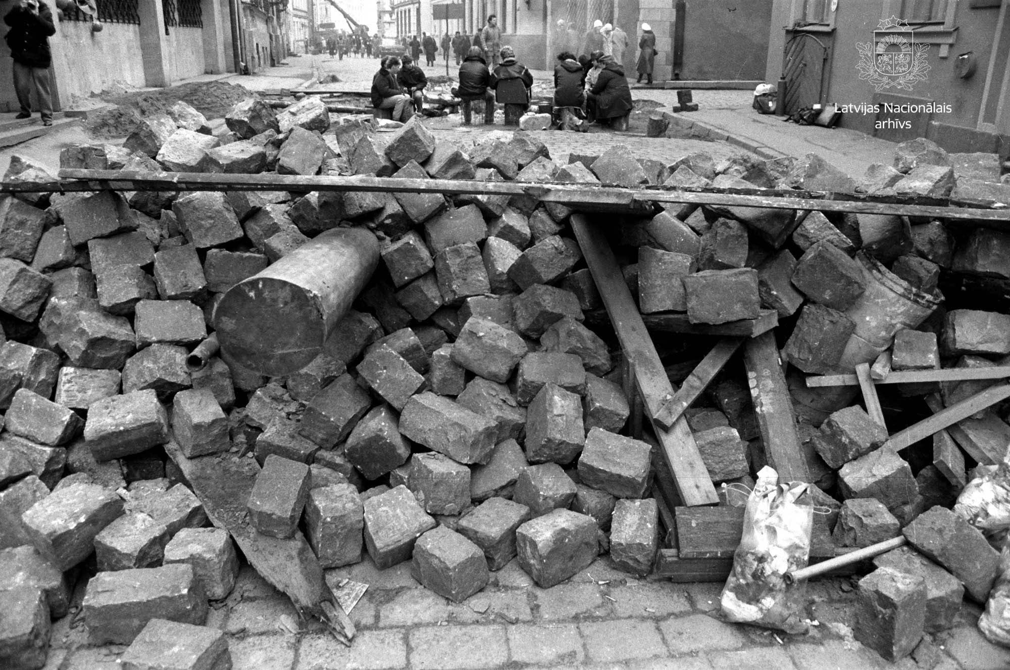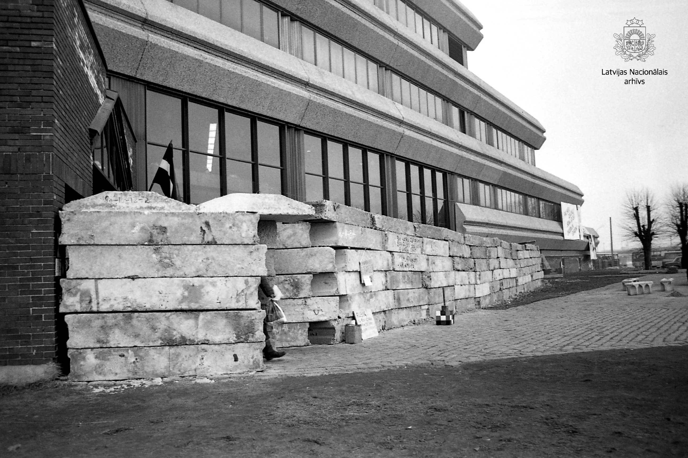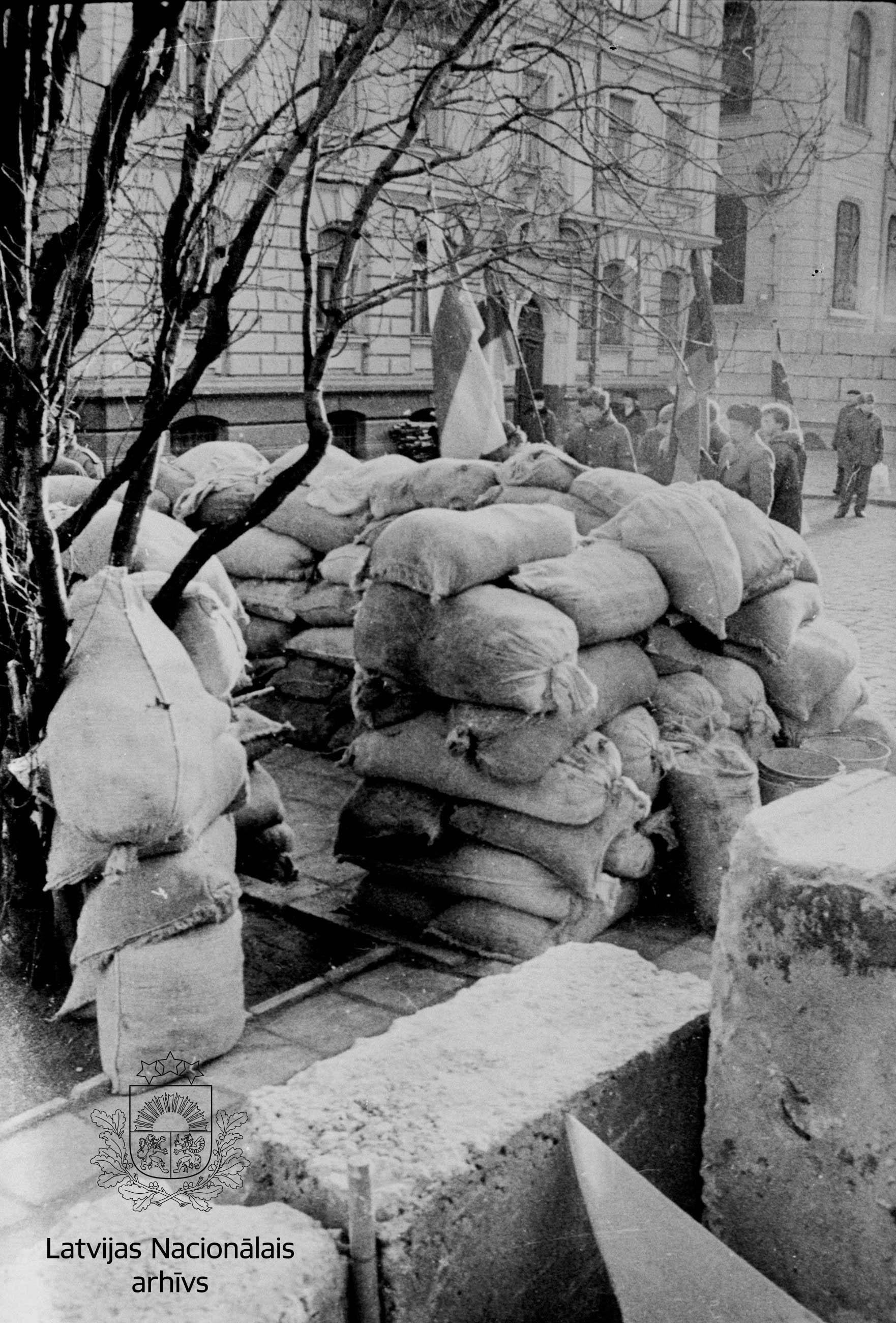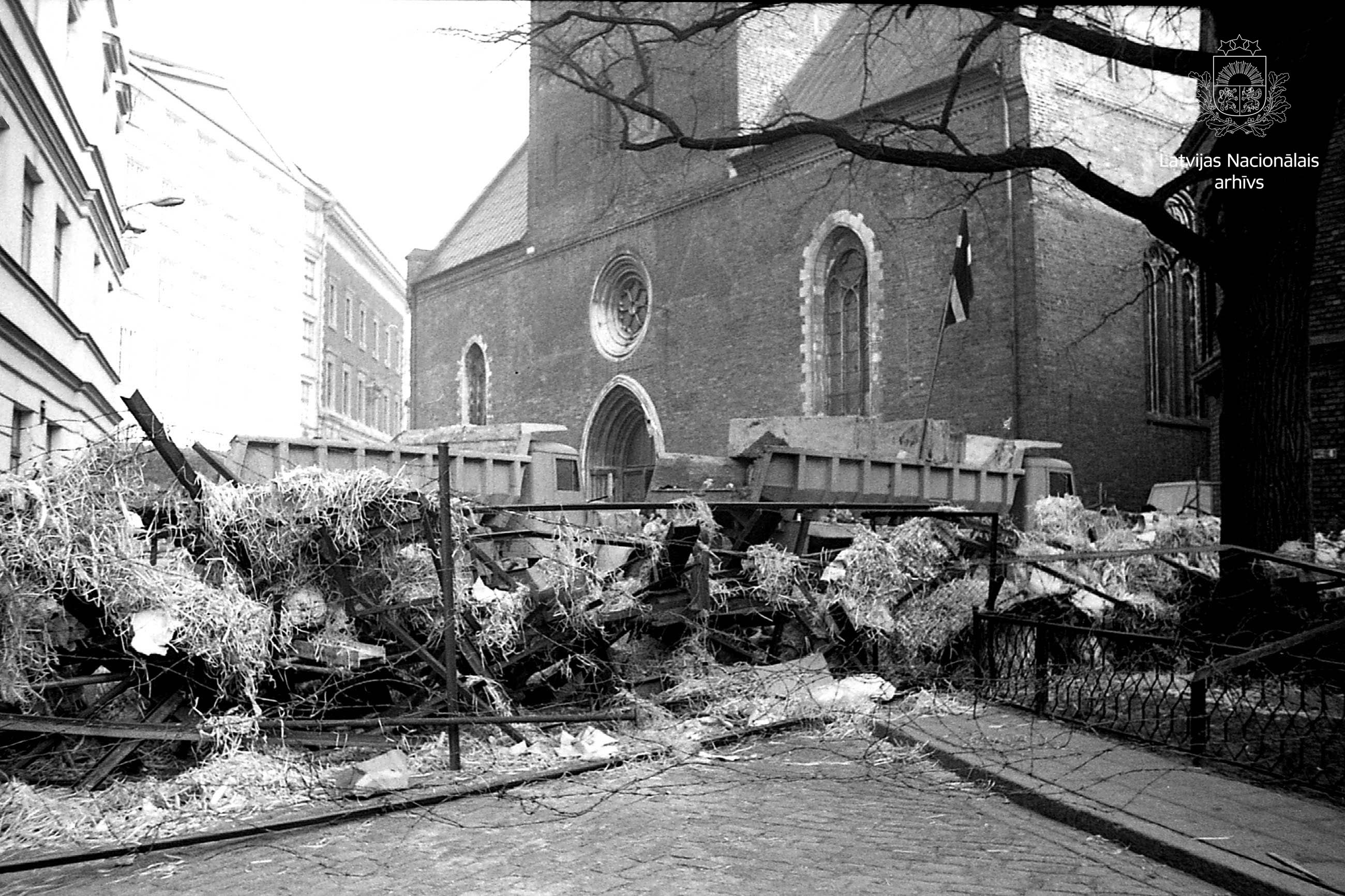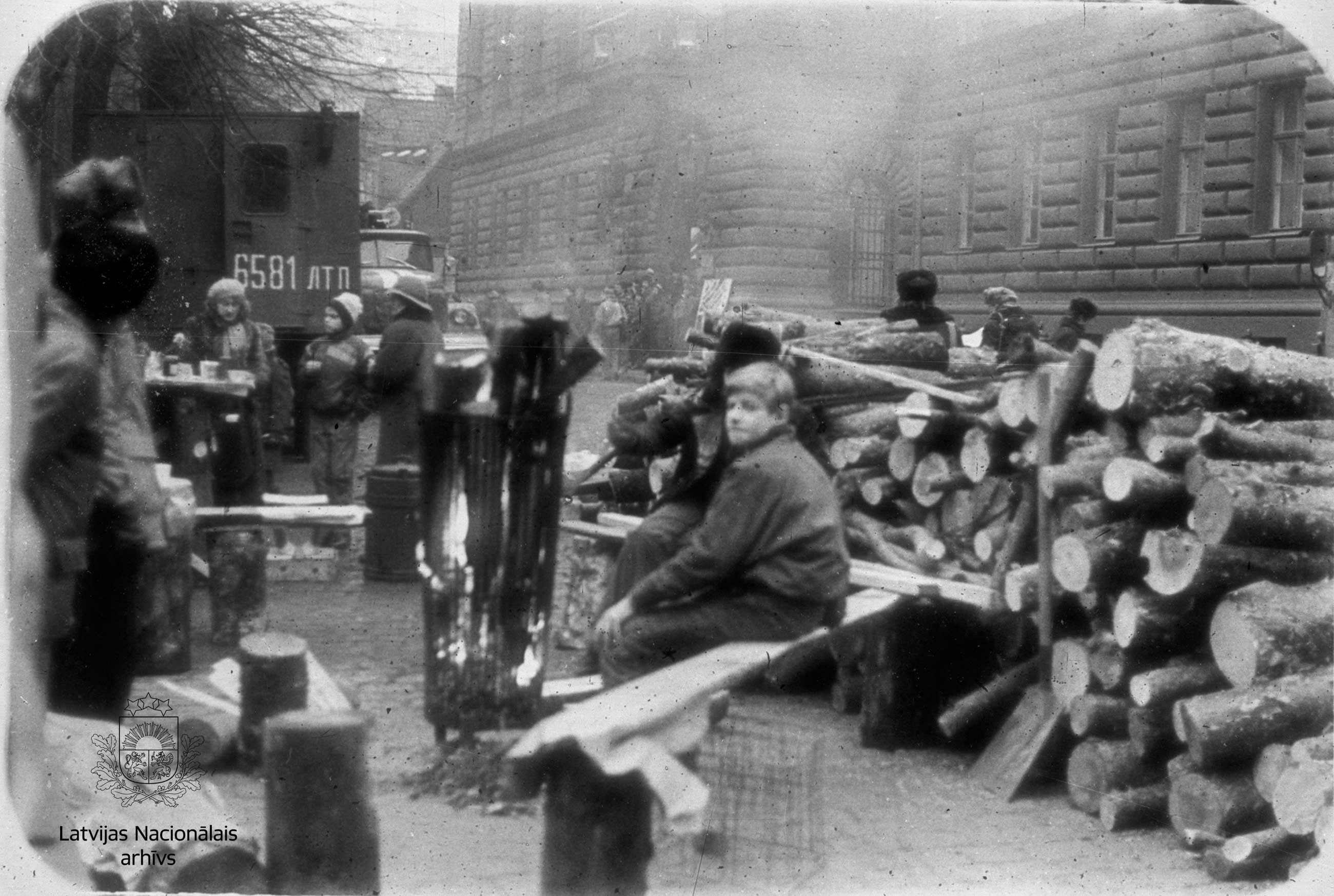 Fona attēls: barikādes Krišjāņa Barona un Dzirnavu ielu krustojumā. Rīga, 1991. gada 14. janvāris. Fotogrāfs P. Eglītis. LNA