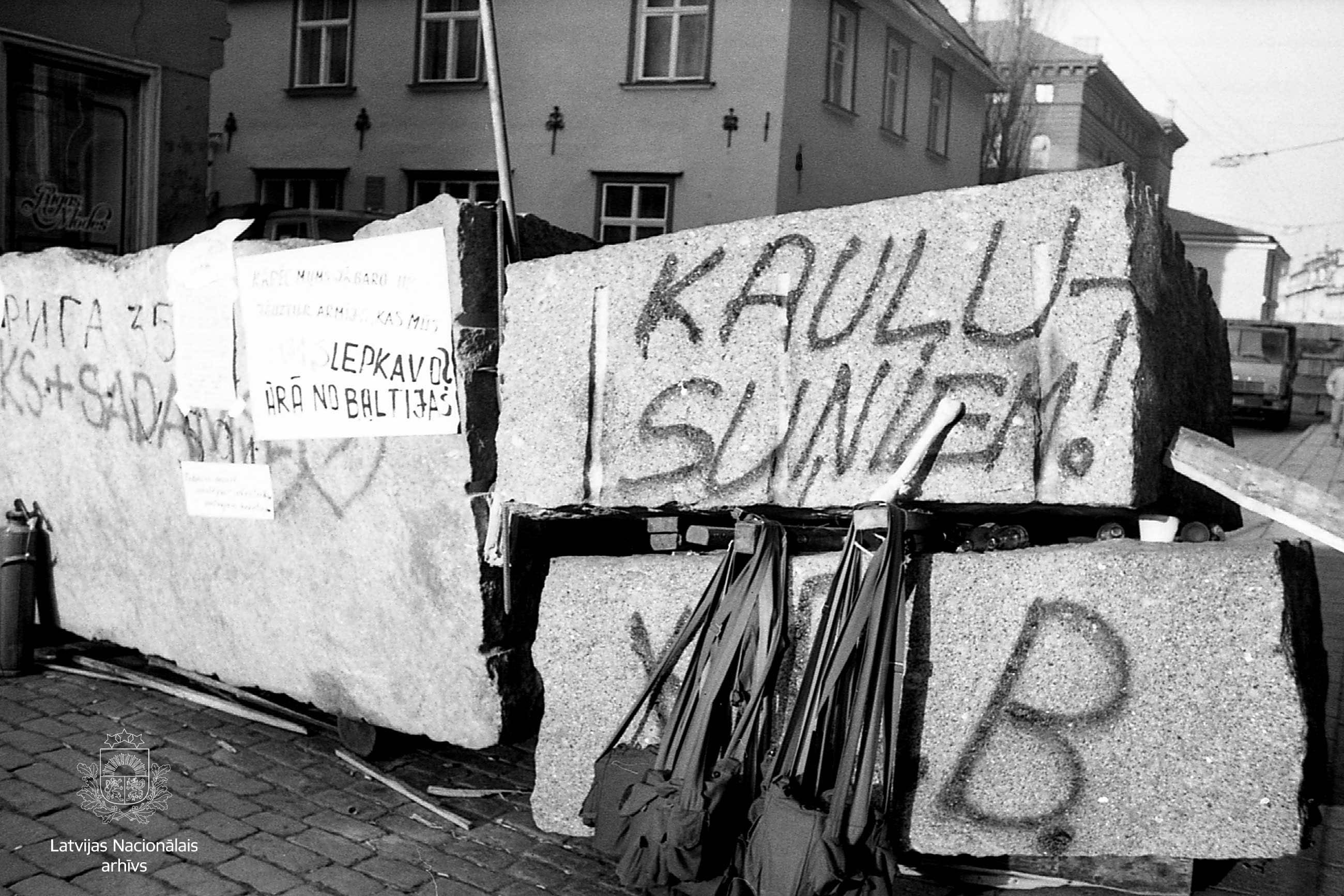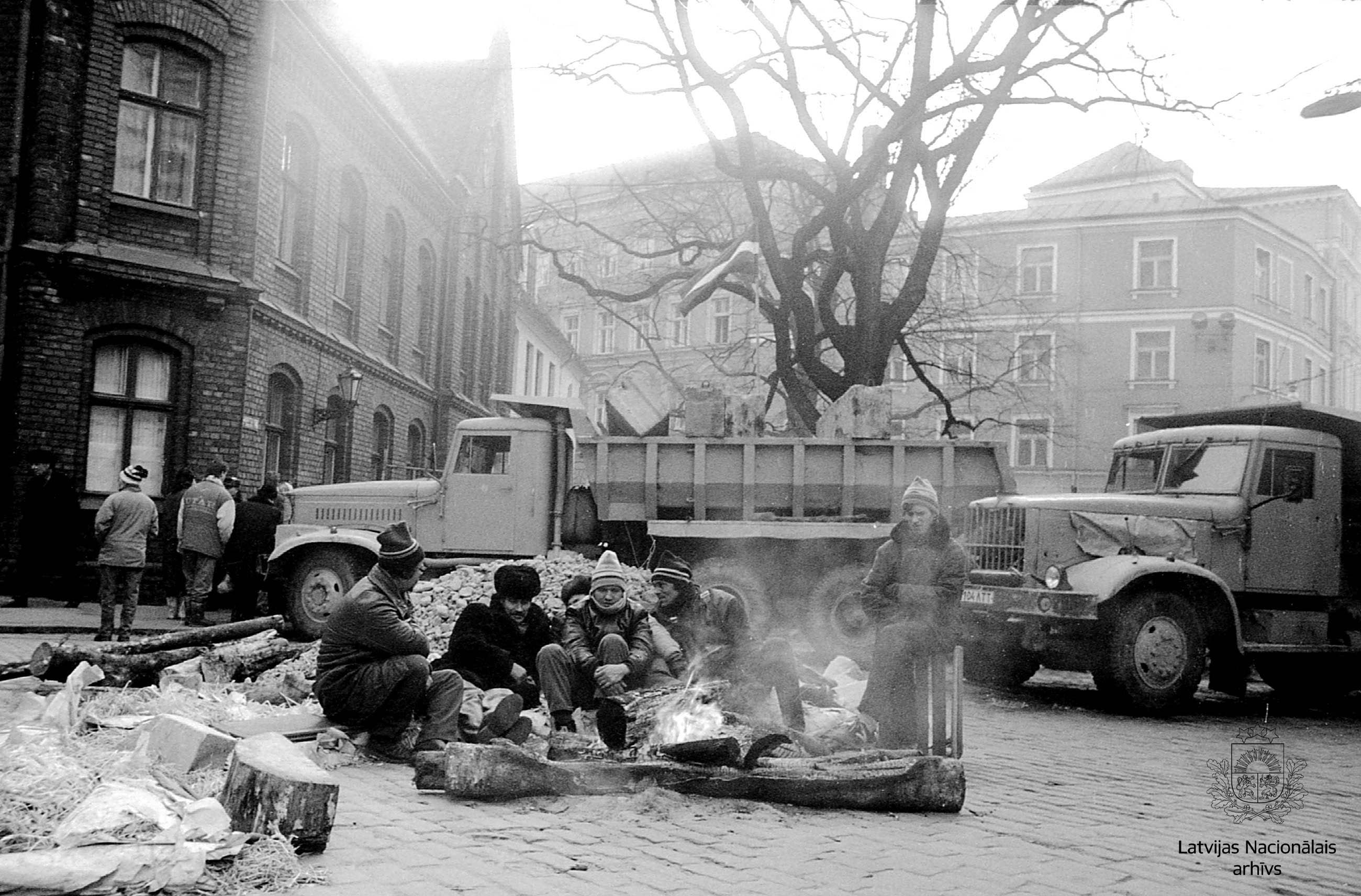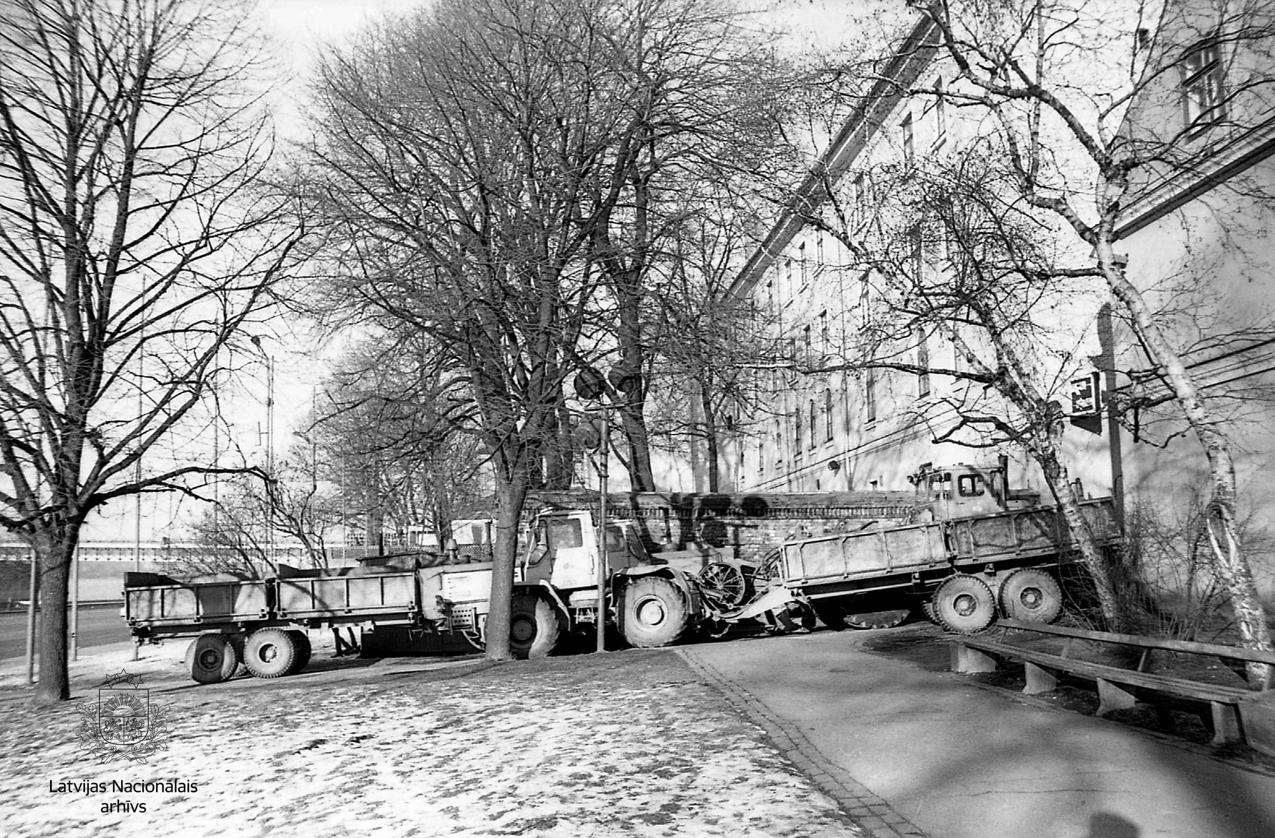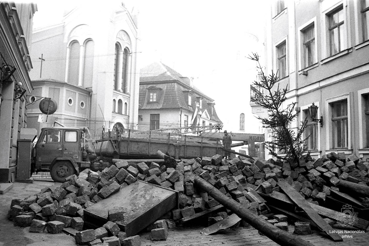 Fona attēls: barikādes Krišjāņa Barona un Dzirnavu ielu krustojumā. Rīga, 1991. gada 14. janvāris. Fotogrāfs P. Eglītis. LNA