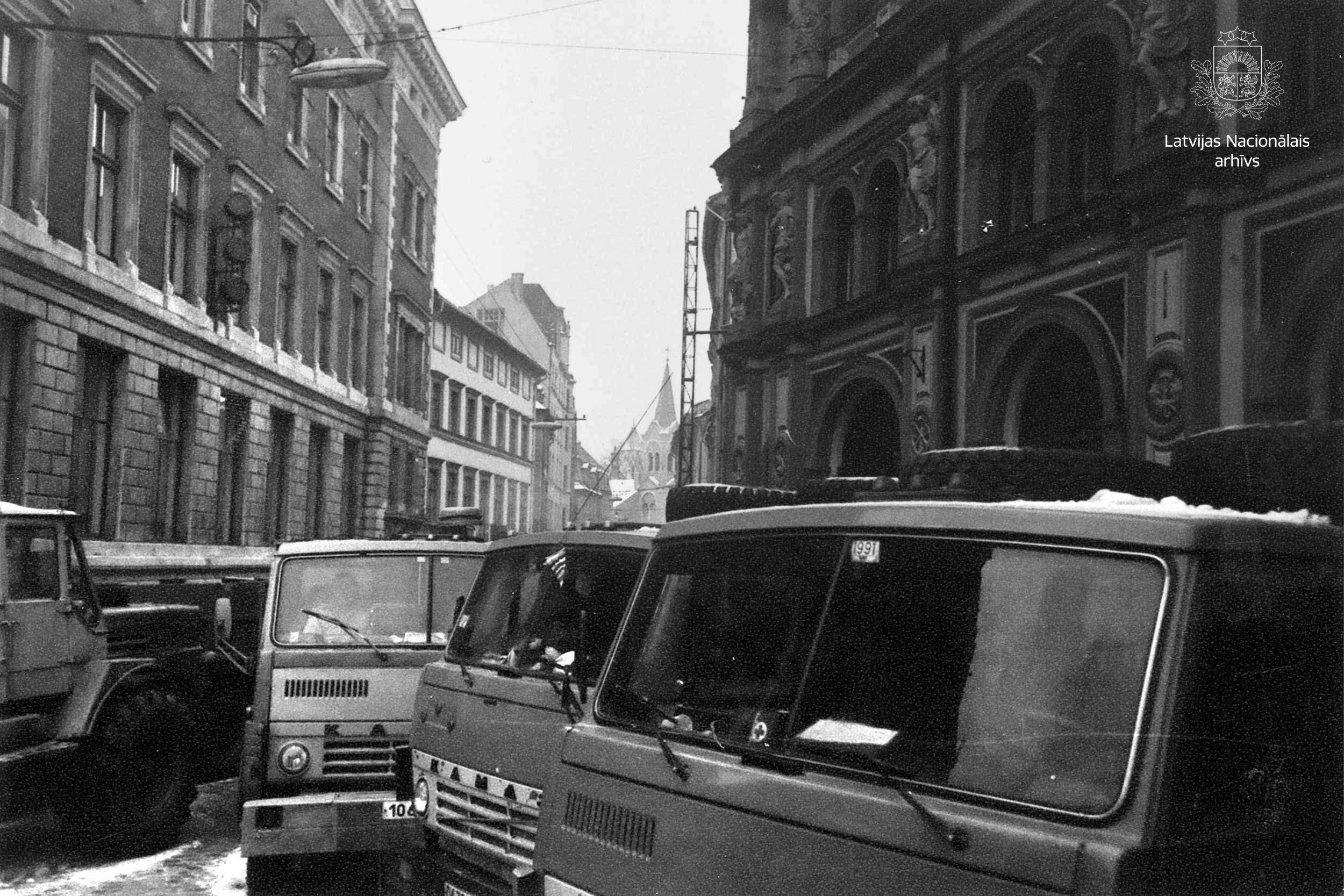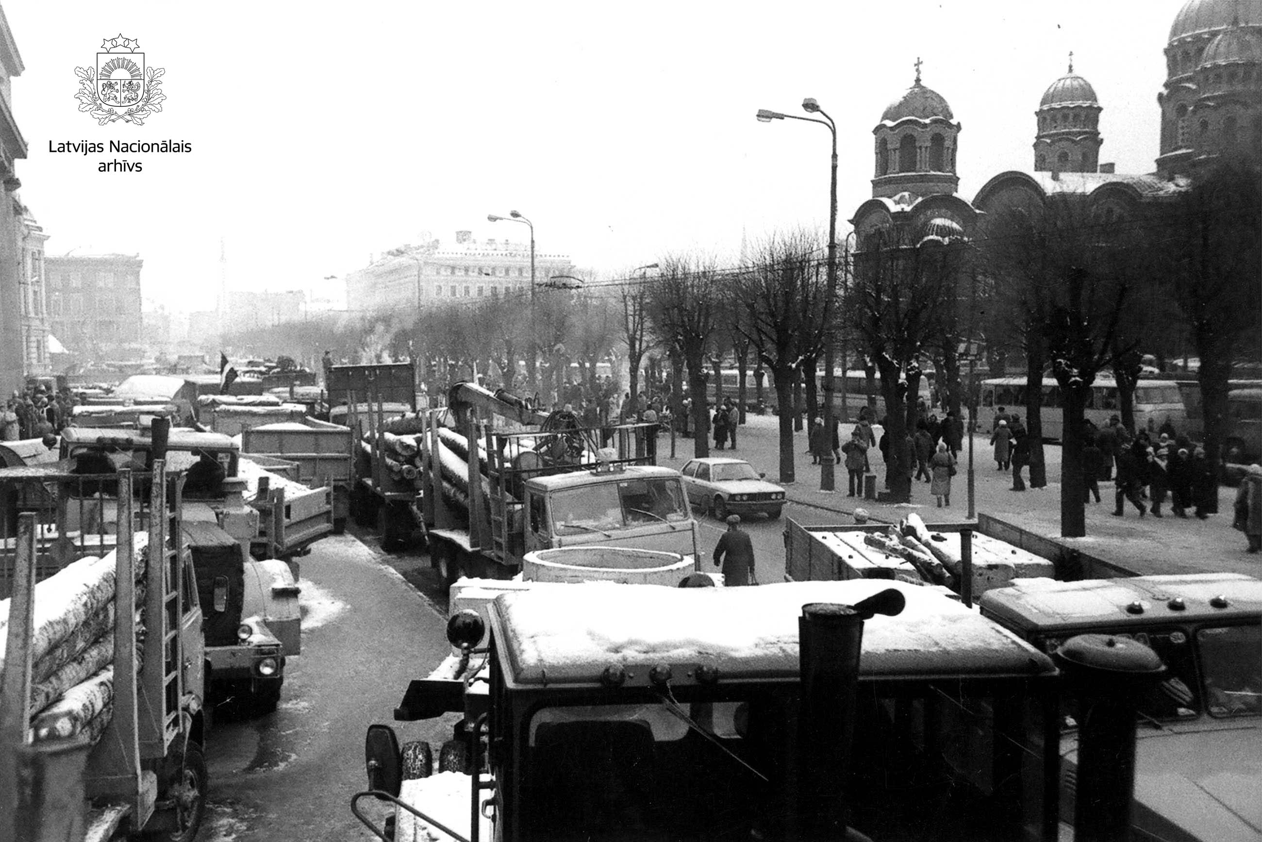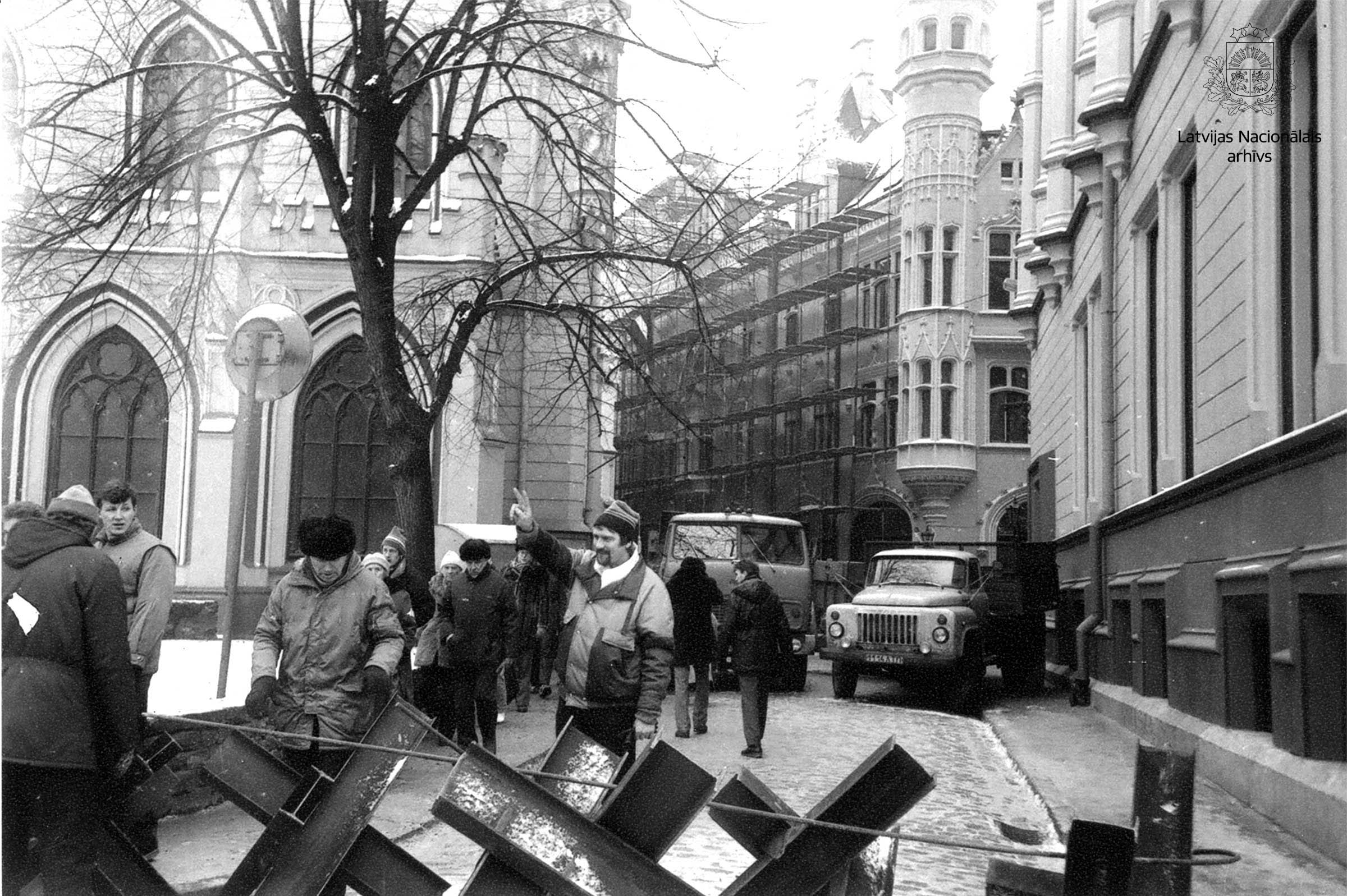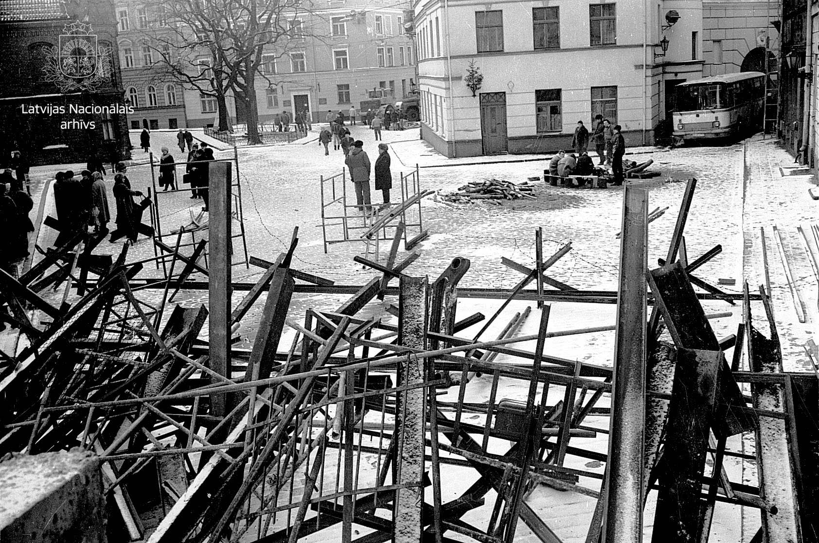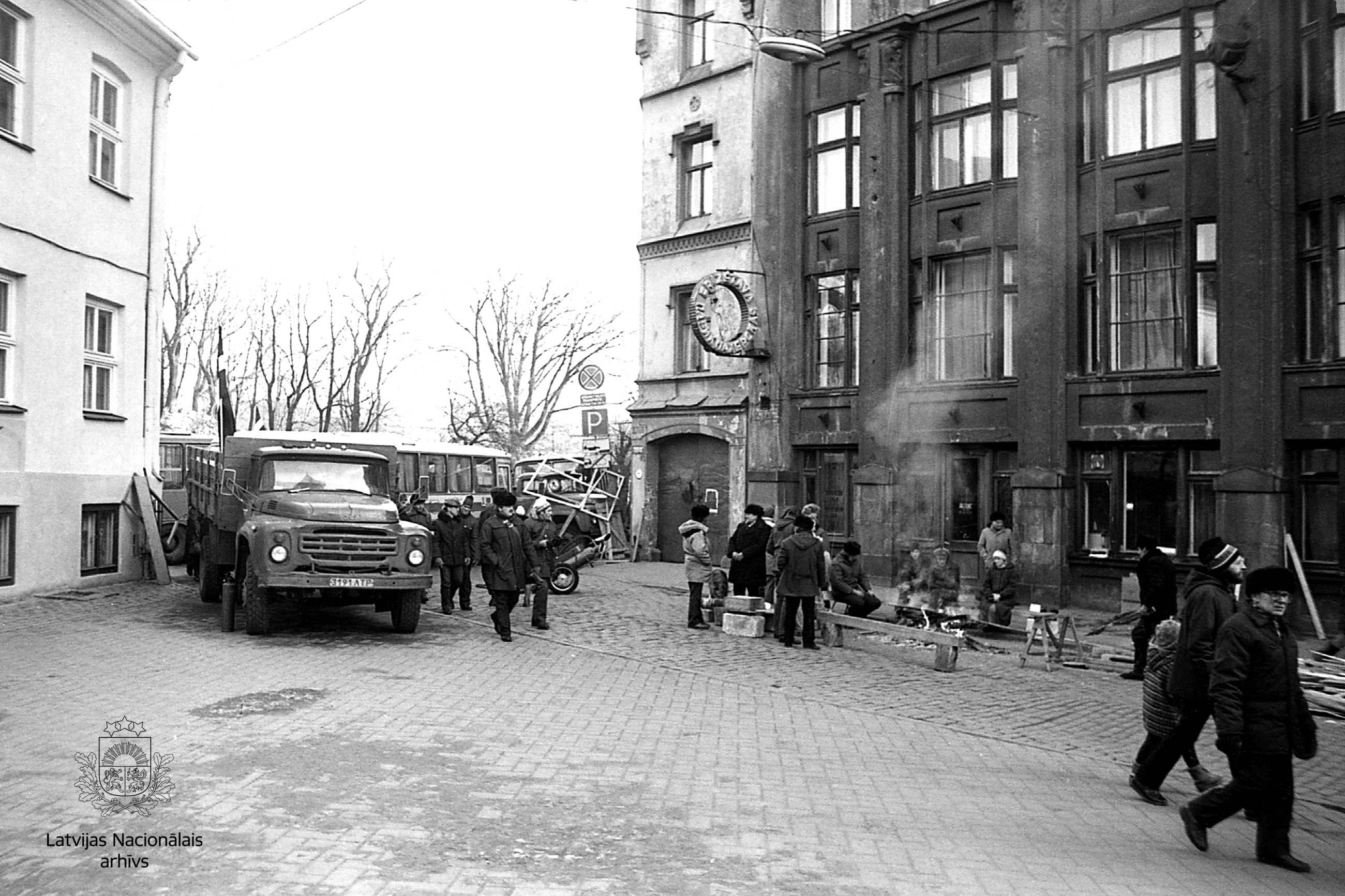 Fona attēls: barikādes Krišjāņa Barona un Dzirnavu ielu krustojumā. Rīga, 1991. gada 14. janvāris. Fotogrāfs P. Eglītis. LNA