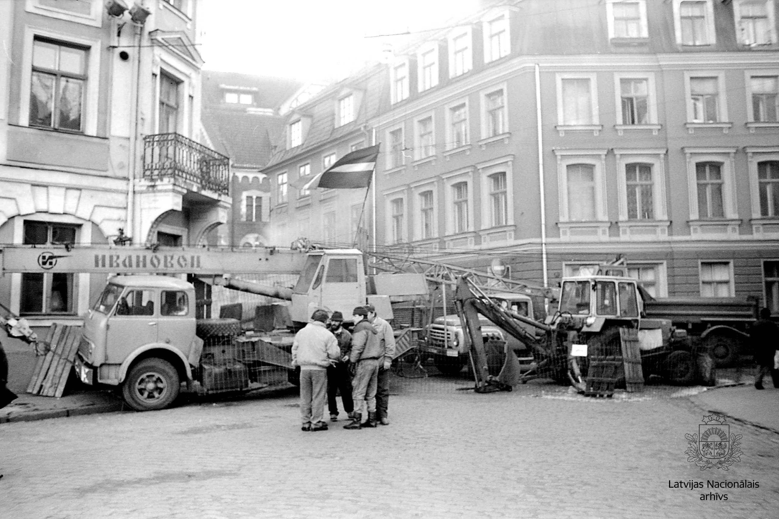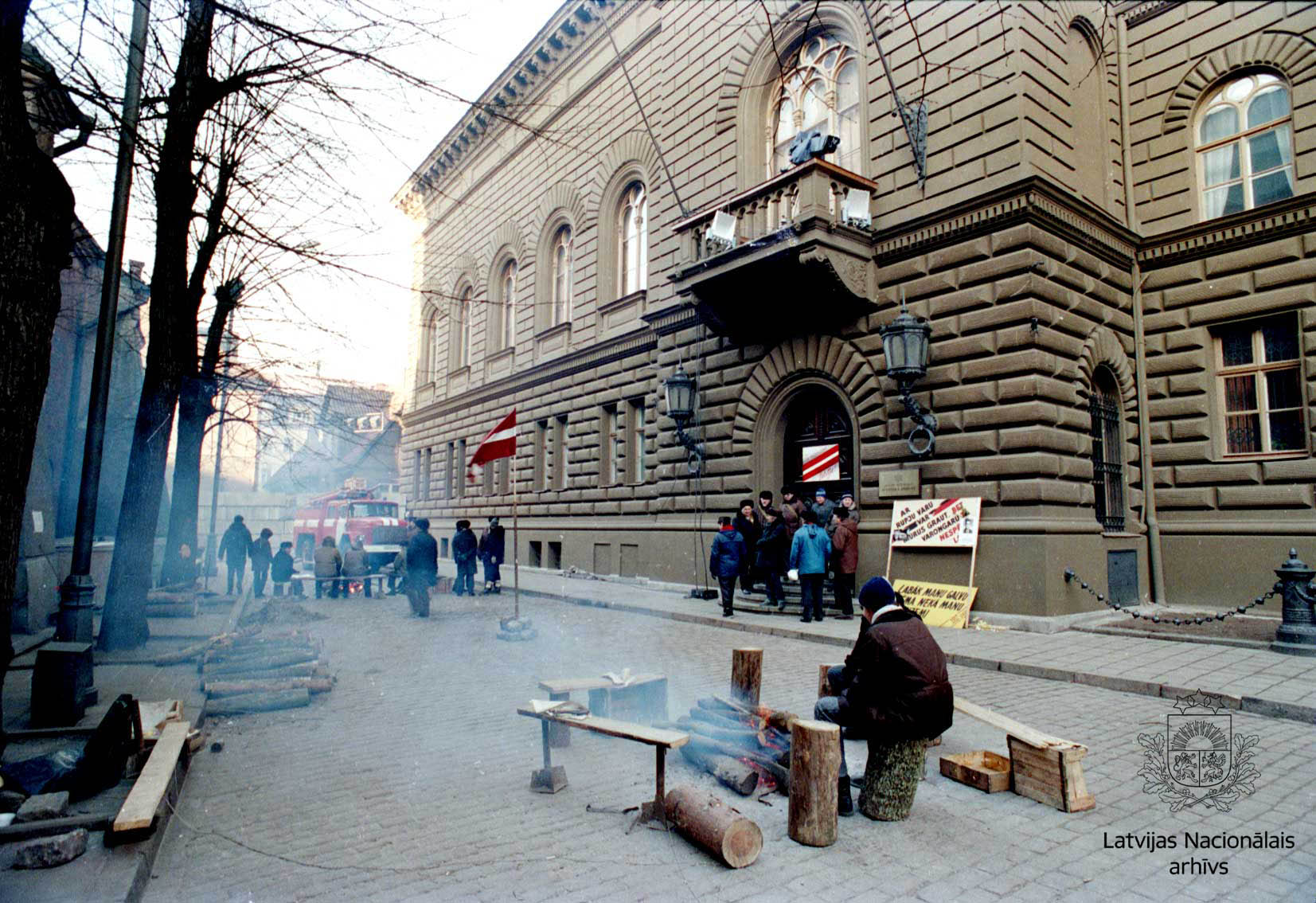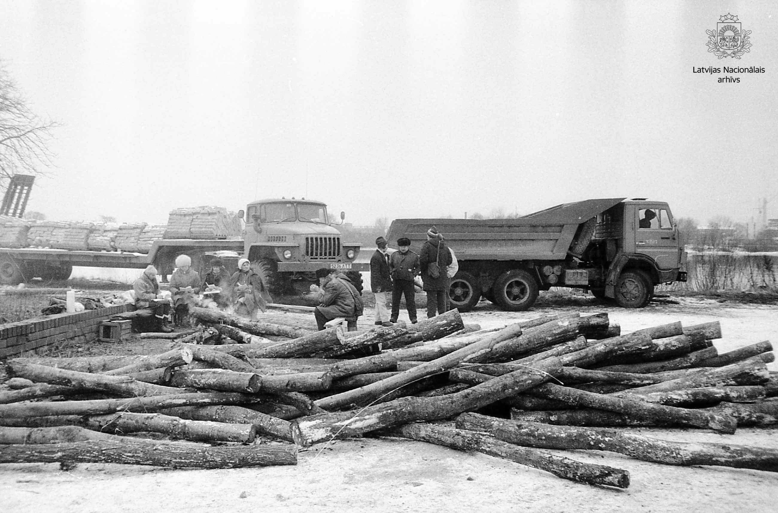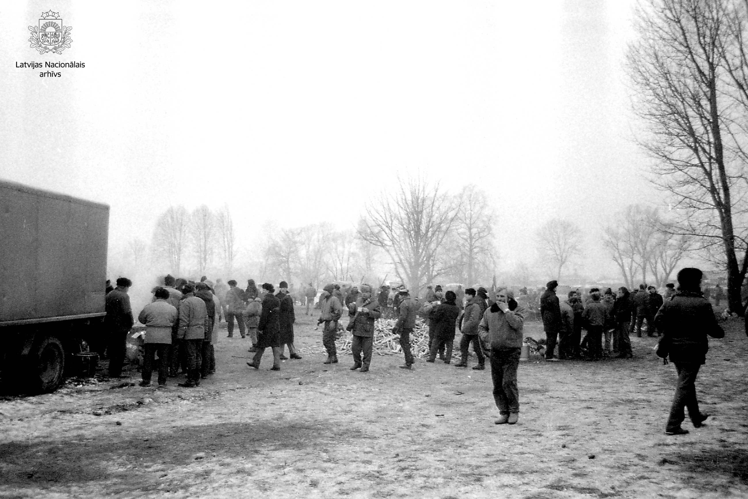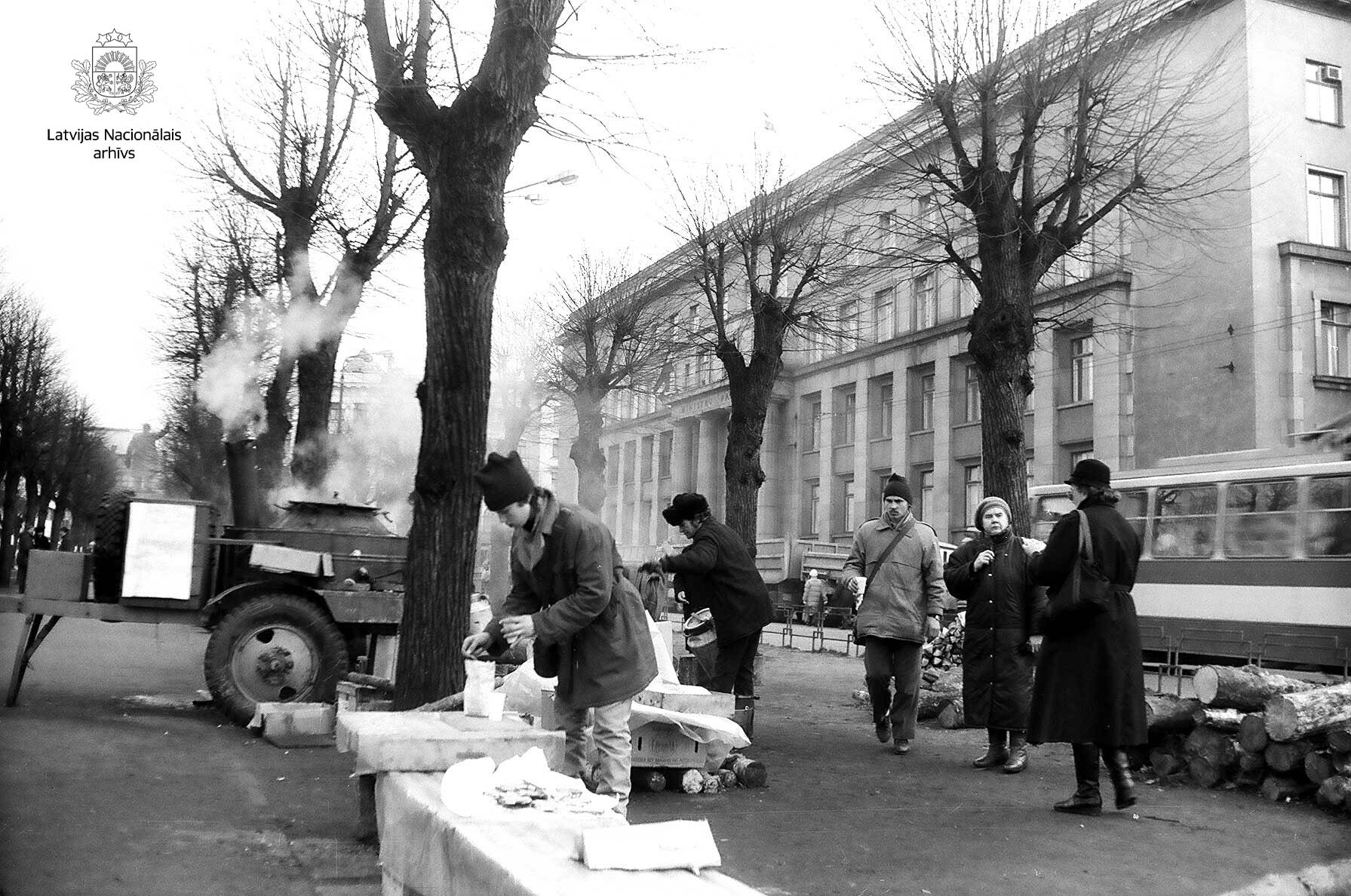 Fona attēls: barikādes Krišjāņa Barona un Dzirnavu ielu krustojumā. Rīga, 1991. gada 14. janvāris. Fotogrāfs P. Eglītis. LNA