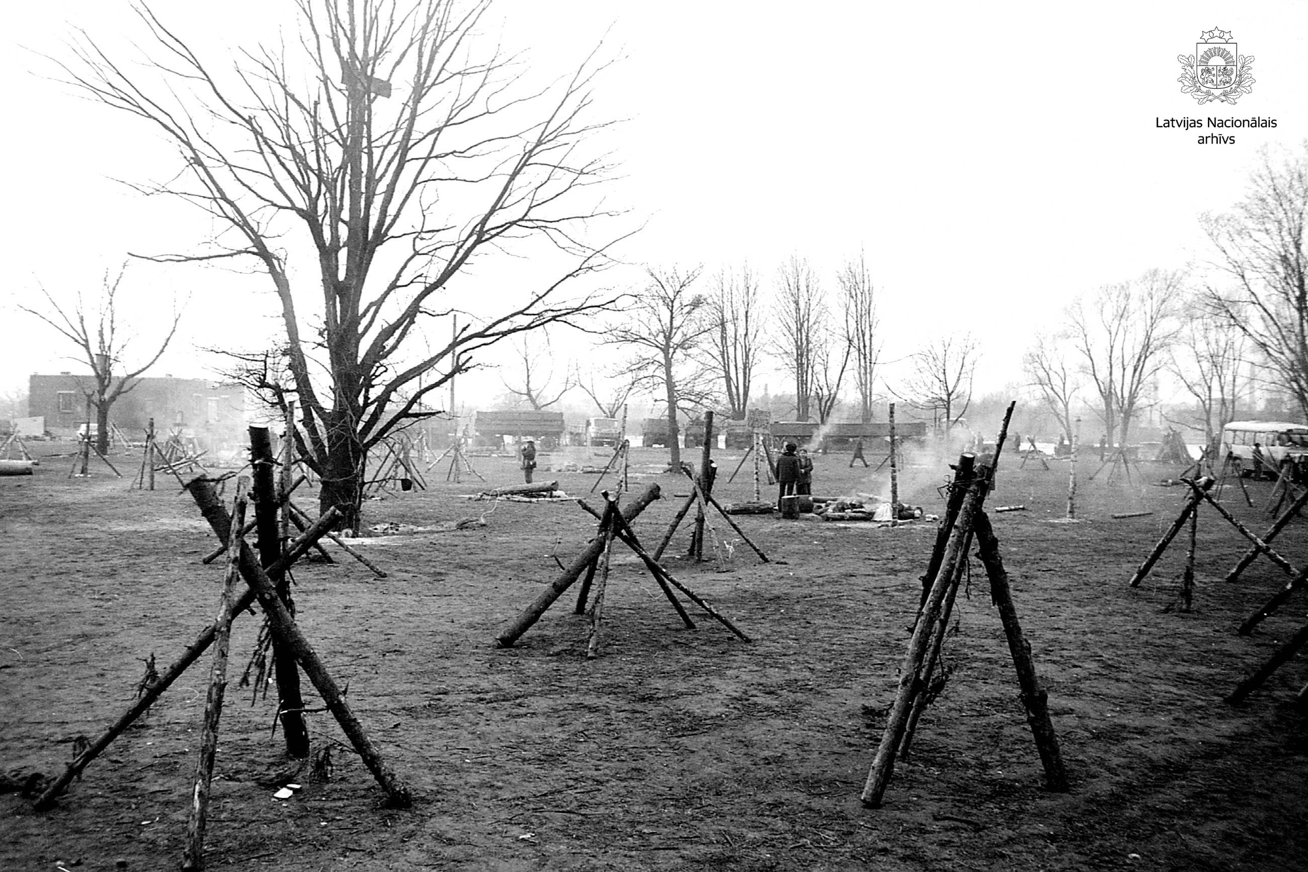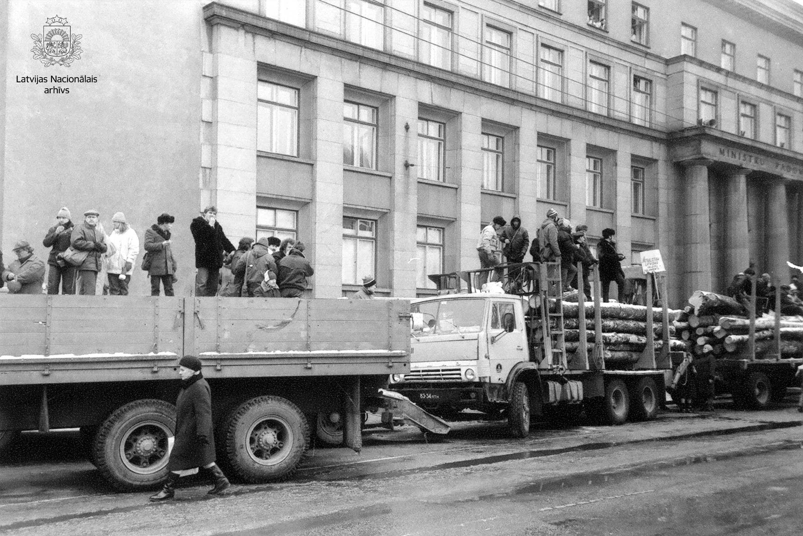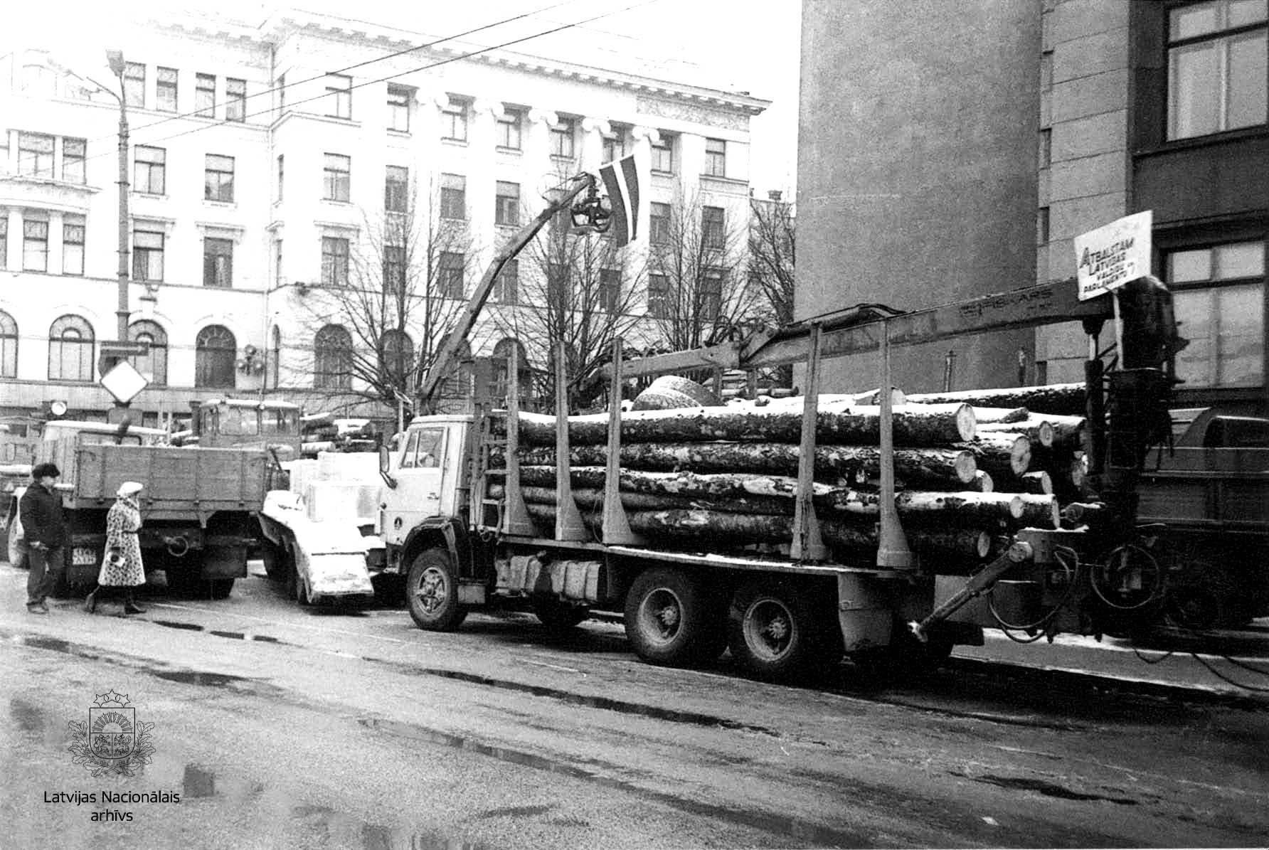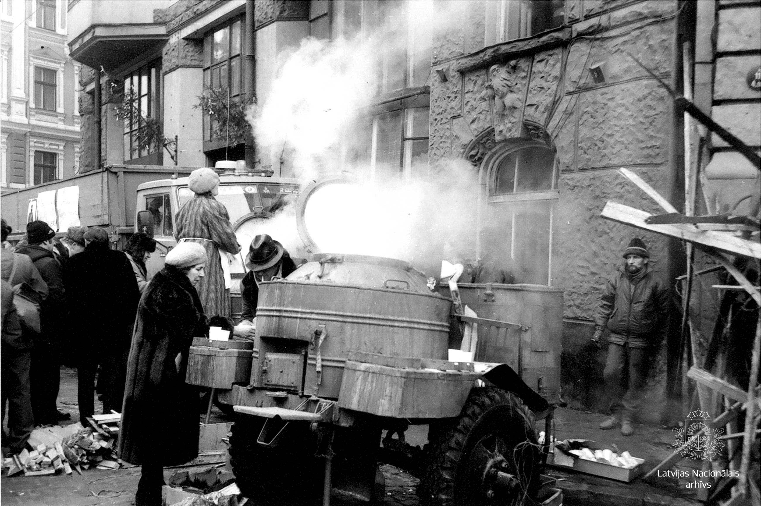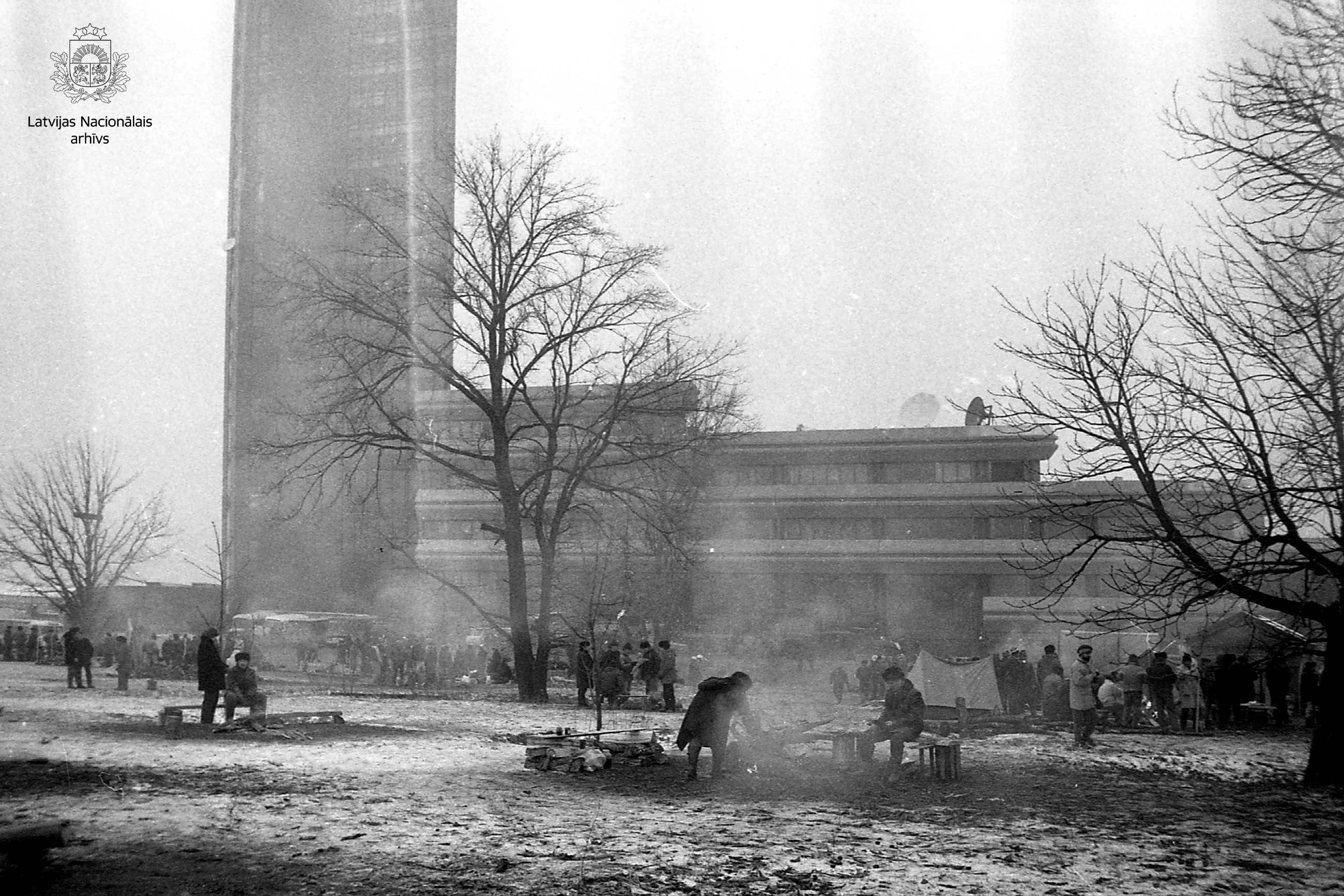 Fona attēls: barikādes Krišjāņa Barona un Dzirnavu ielu krustojumā. Rīga, 1991. gada 14. janvāris. Fotogrāfs P. Eglītis. LNA