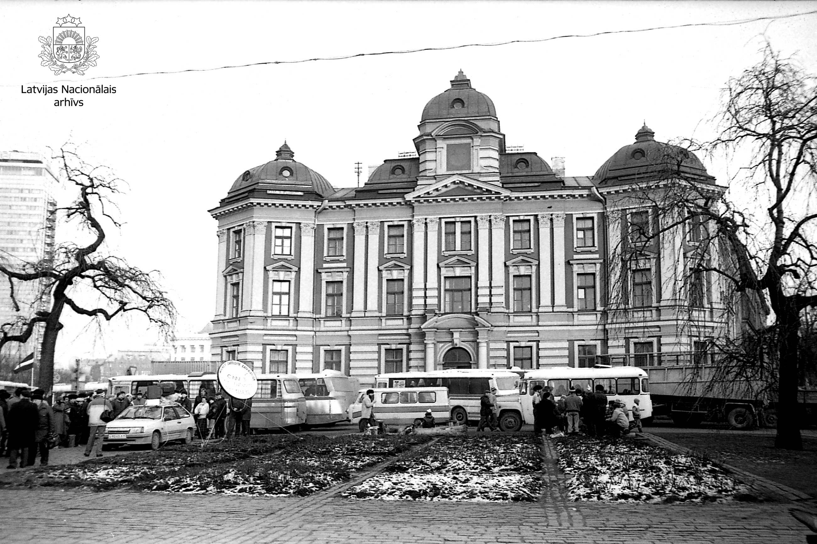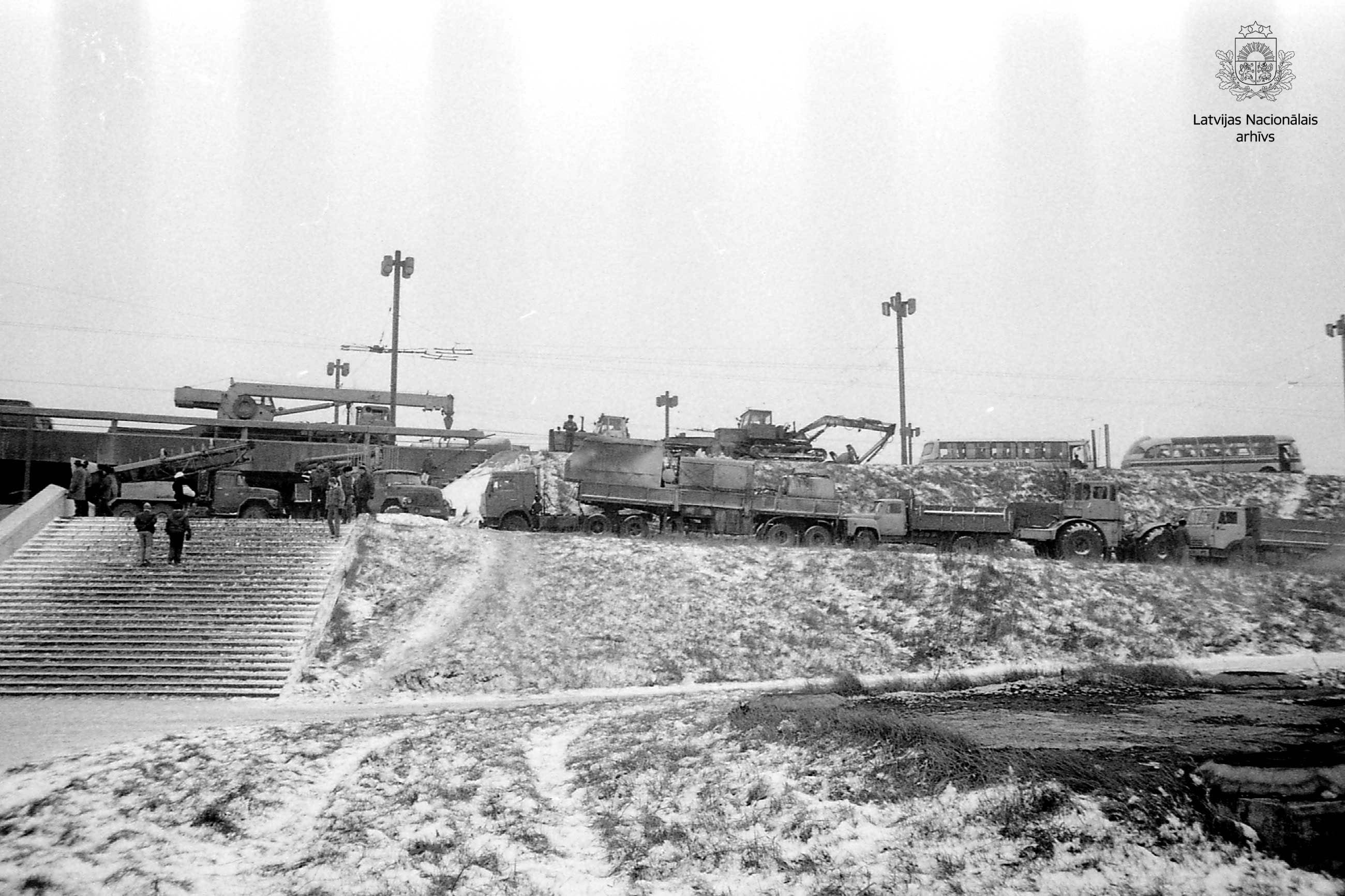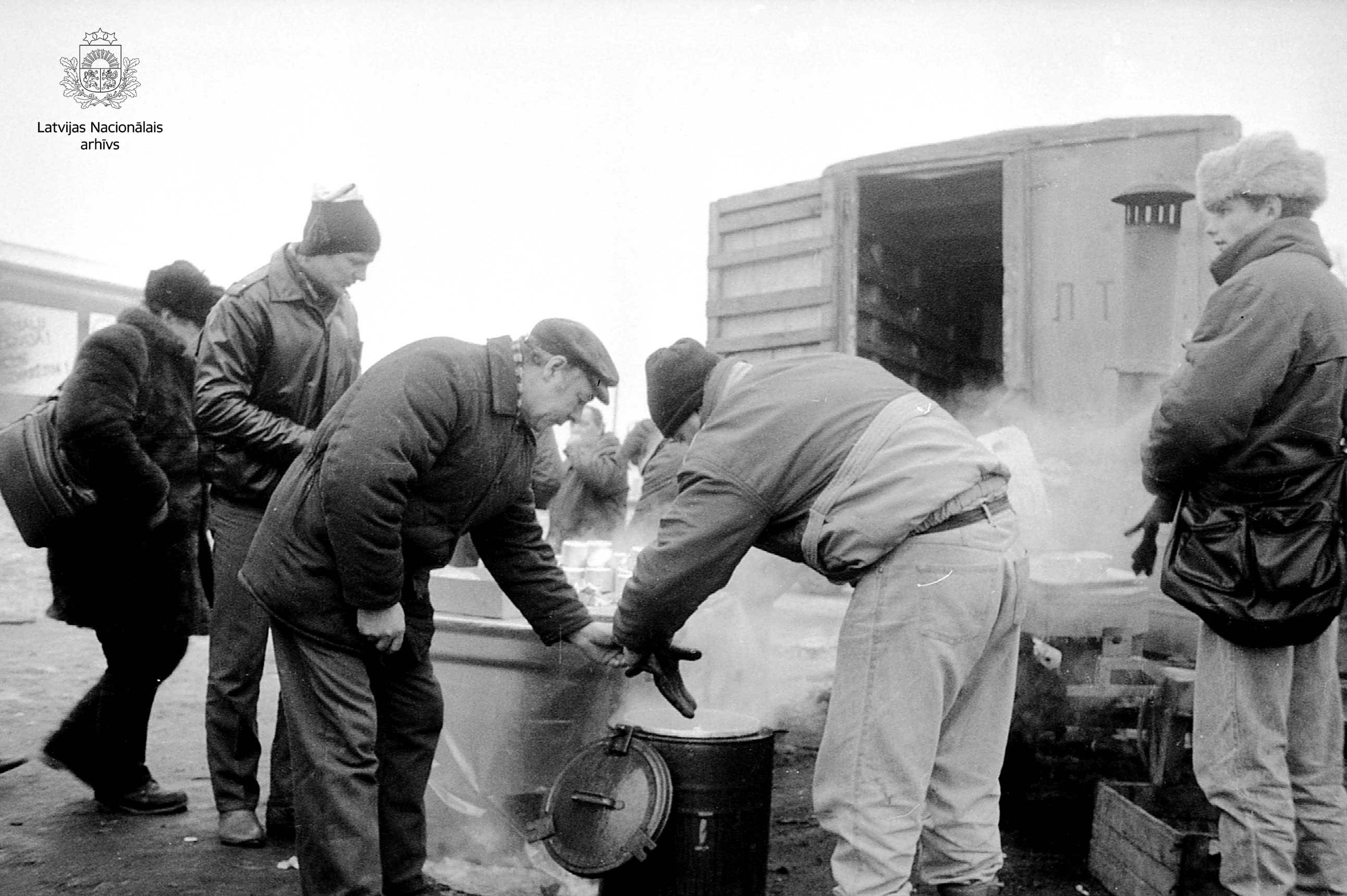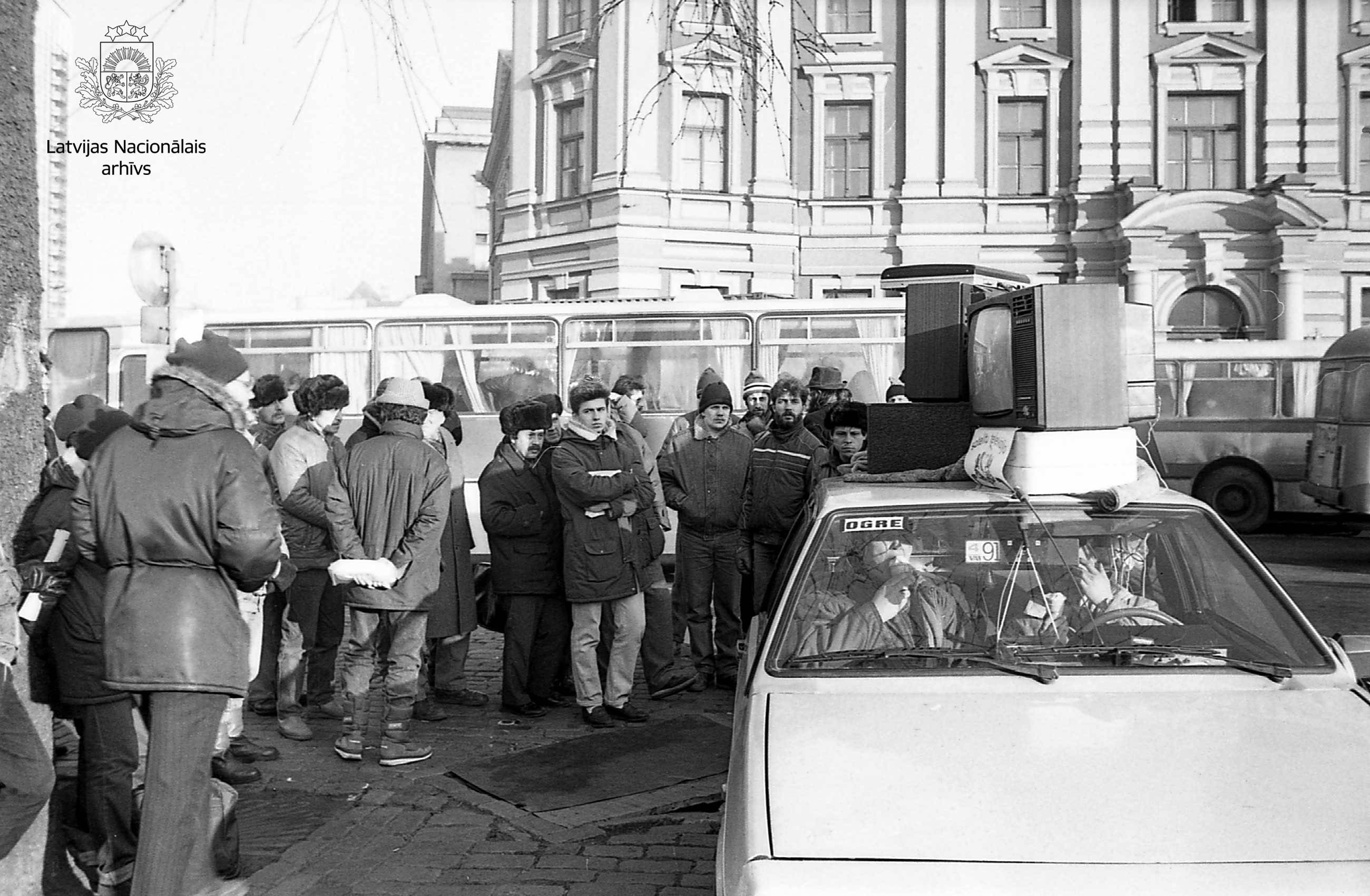 Fona attēls: barikādes Krišjāņa Barona un Dzirnavu ielu krustojumā. Rīga, 1991. gada 14. janvāris. Fotogrāfs P. Eglītis. LNA