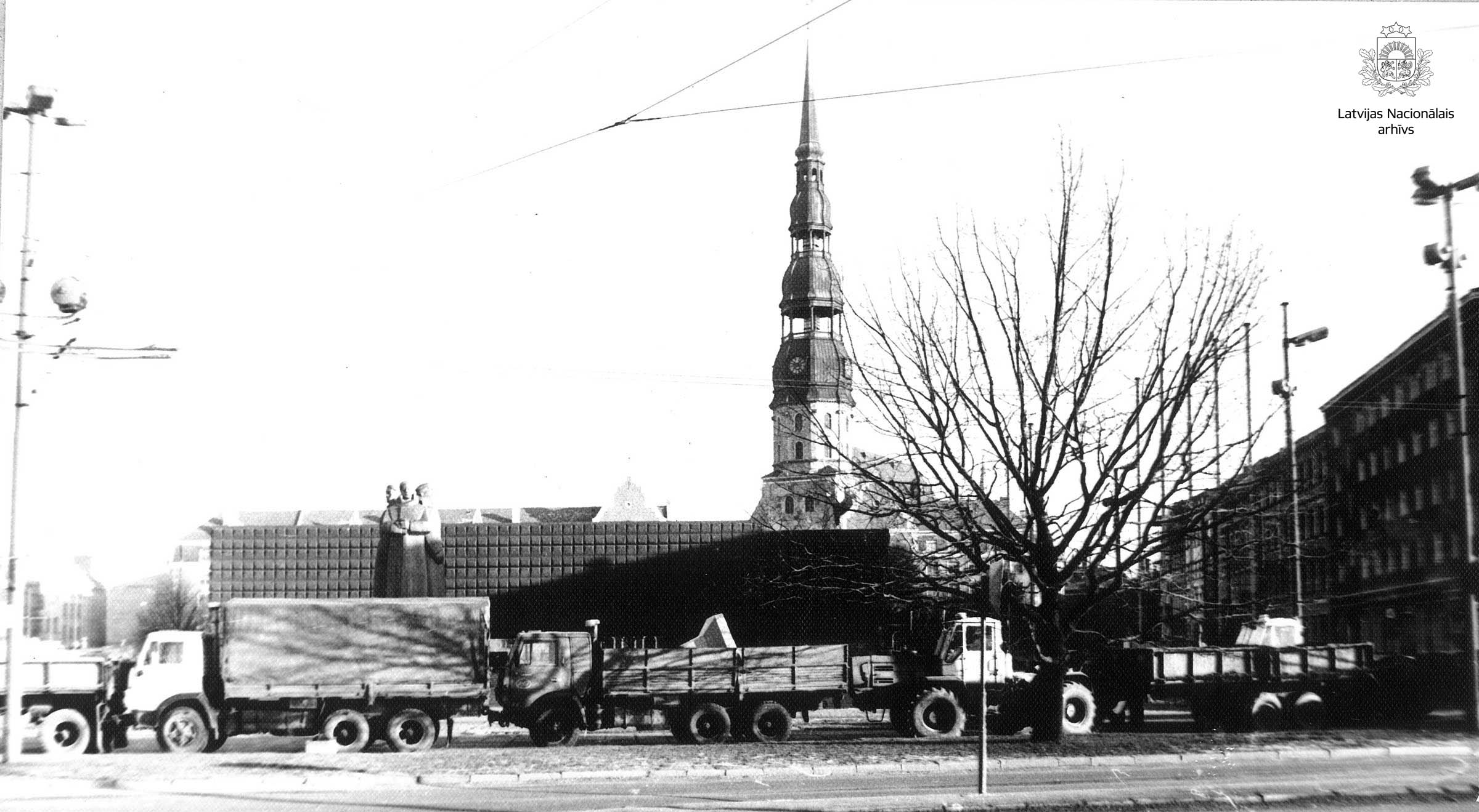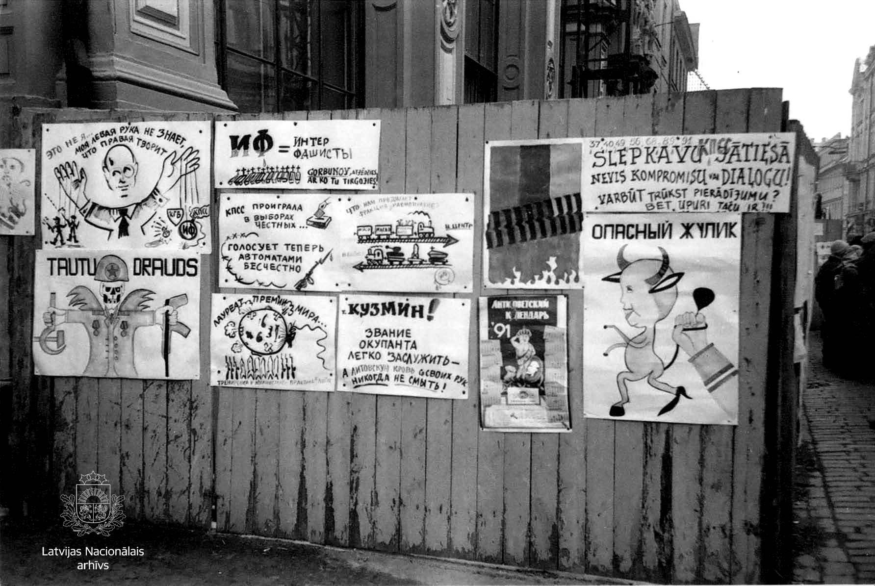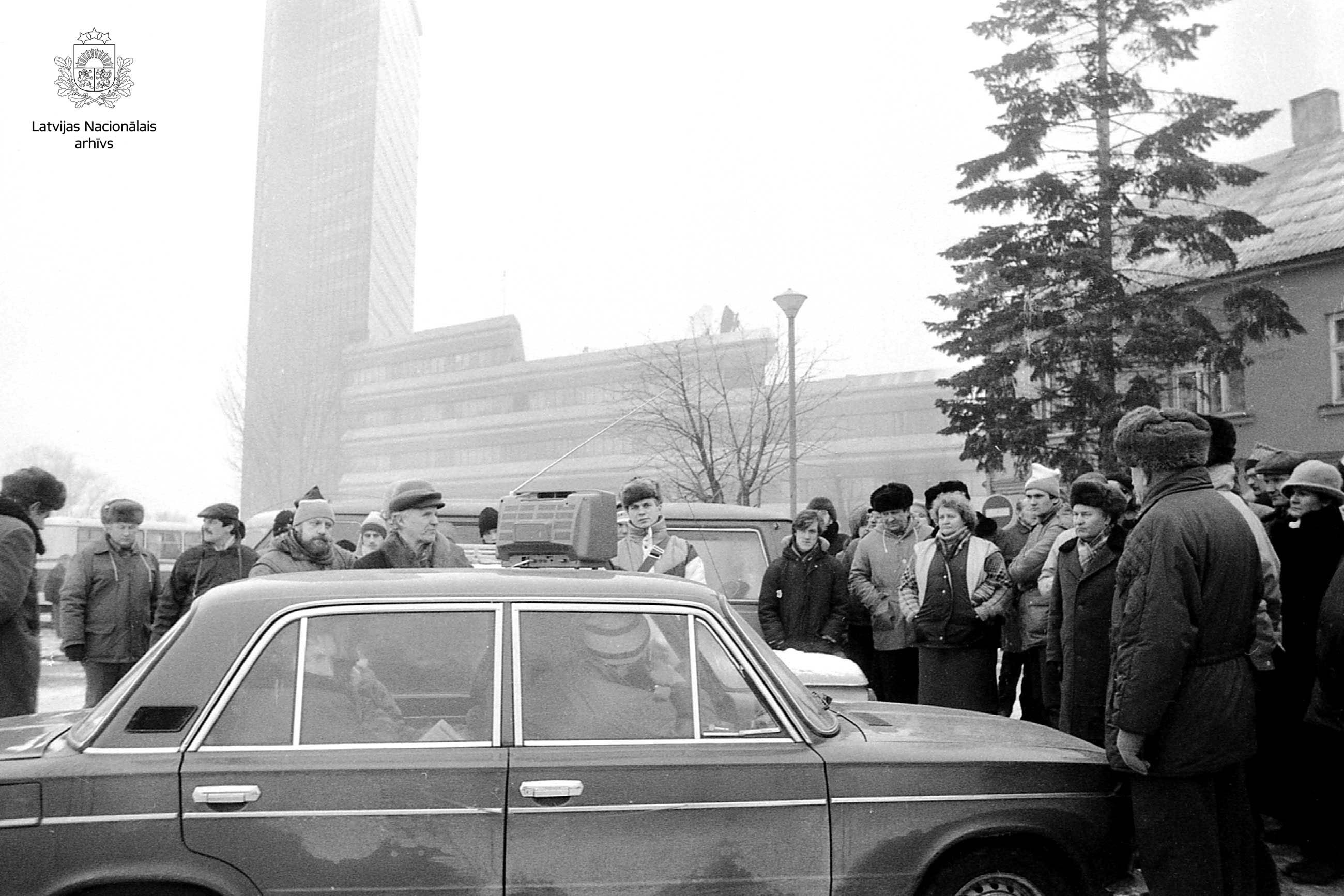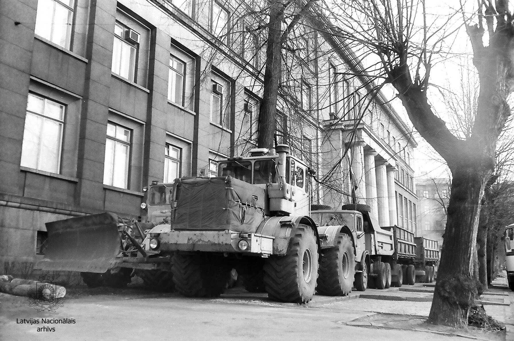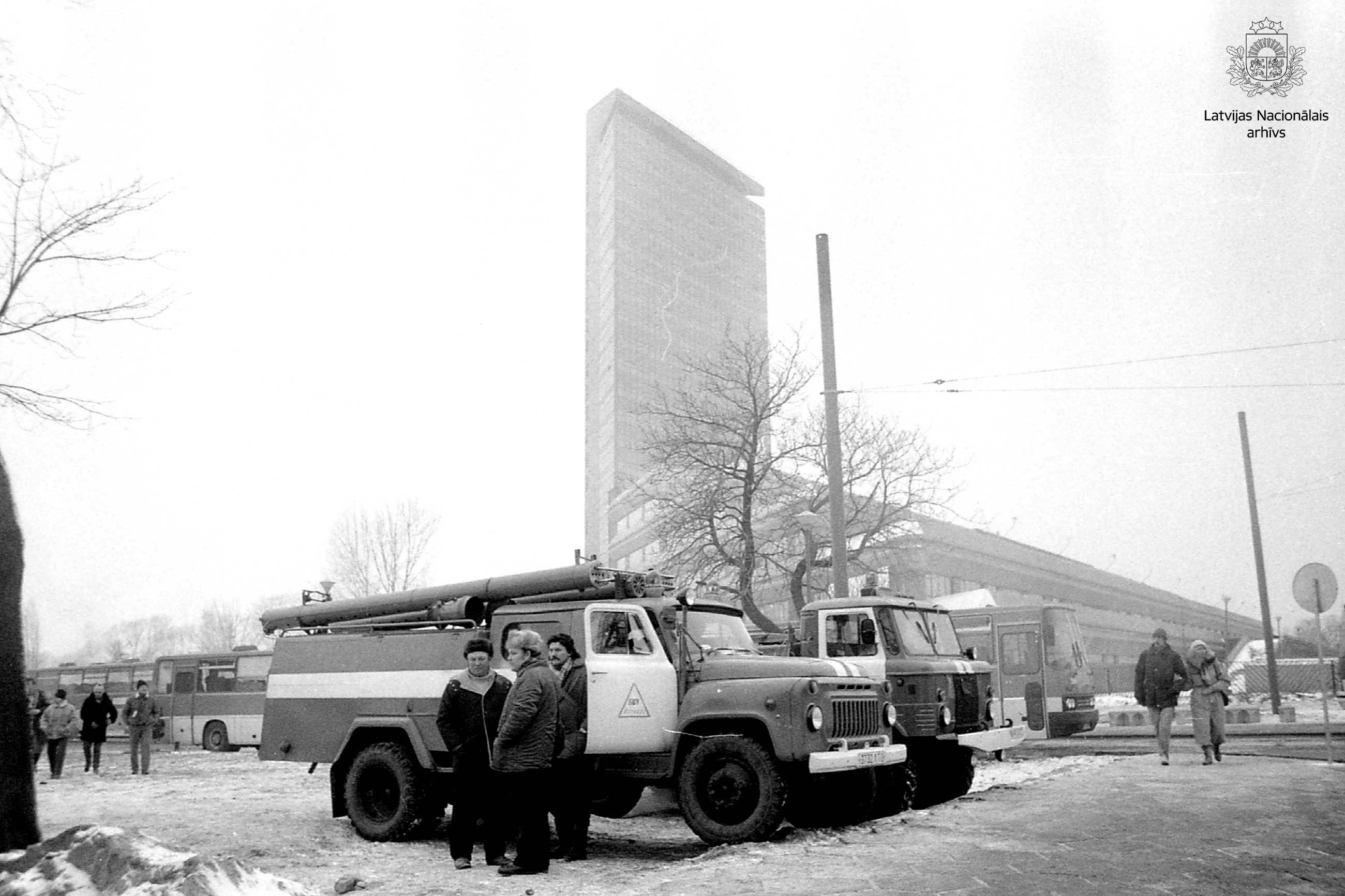 Fona attēls: barikādes Krišjāņa Barona un Dzirnavu ielu krustojumā. Rīga, 1991. gada 14. janvāris. Fotogrāfs P. Eglītis. LNA