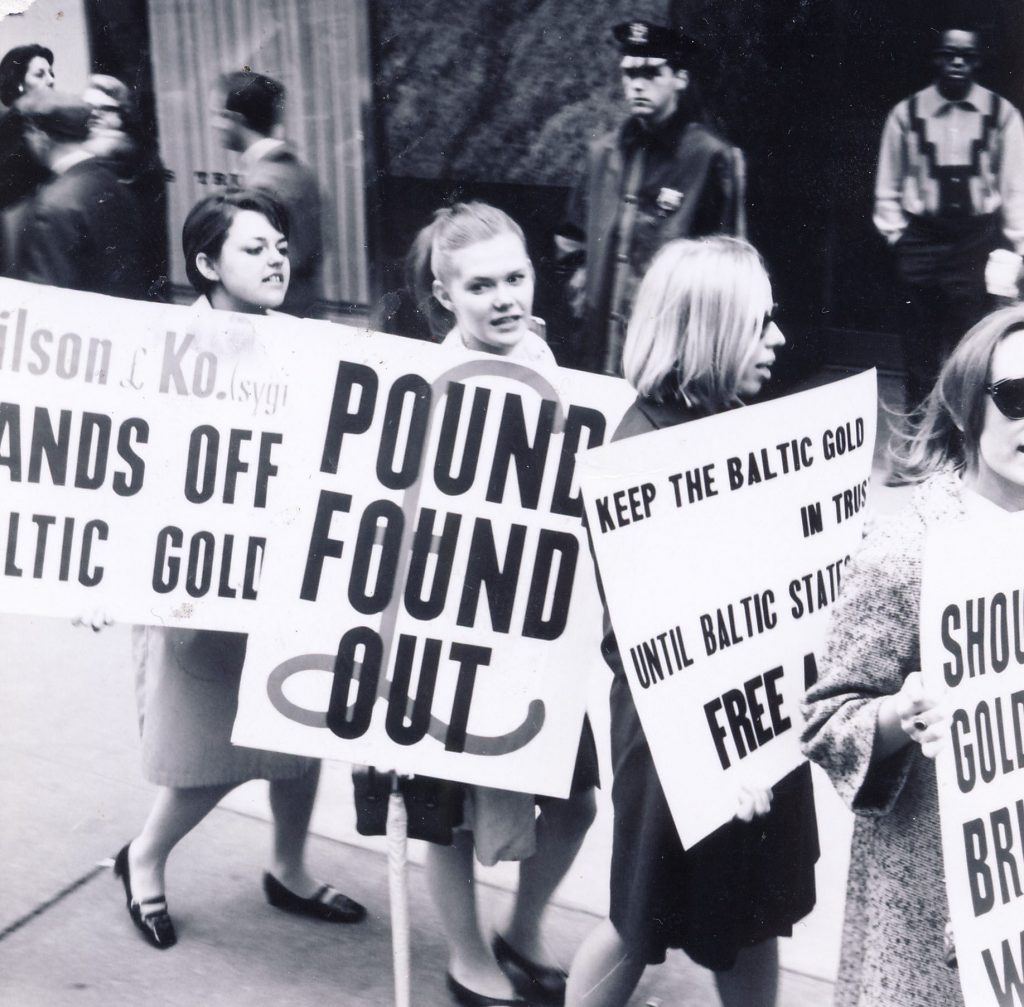 Demonstrators during the Operation Goldfinger campaign. Juta Ristsoo is holding “Pound Found Out”. Source: LNA LVA F.2944 Source: Museum of the Occupation of Latvia.