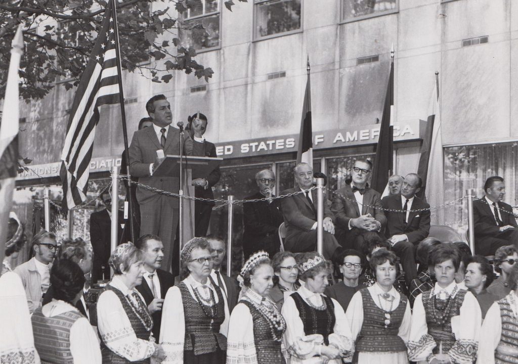 Jonas Balkunas speech at Hammarakjold Plaza near the UN building, 1970. Source: Museum of the Occupation of Latvia.
