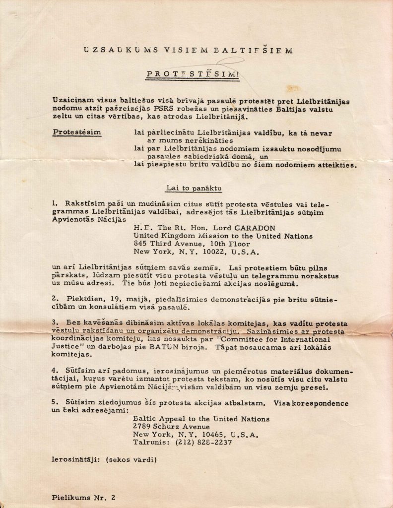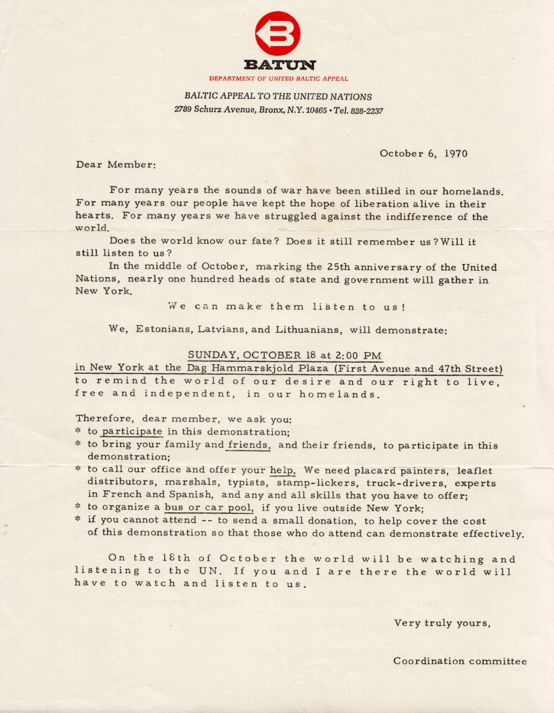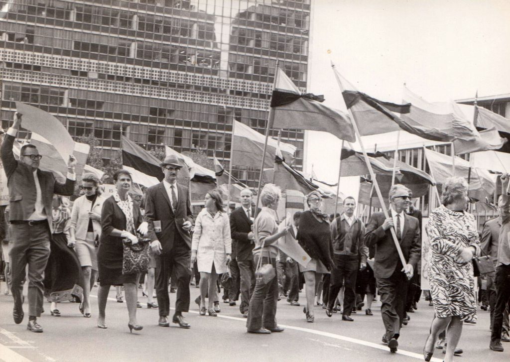 1969 marked the 30th anniversary of the infamous Molotov-Ribbentrop pact between Stalin and Hitler that divided Eastern Europe into two spheres of interest. During a meeting on March 3, 1969, the BATUN board decided that this event would be the focus of the organization’s protest activities for that year. The plan was to stage a rally called Day of Concern on September 20, 1969 at the UN headquarters in New York. In the days prior to the rally, BATUN members distributed leaflets in midtown Manhattan. However, only about 500 people attended the rally. The participants approved a resolution condemning the Soviet Union and calling upon the member states of the UN to call upon the Soviet Union to cease its occupation of the Baltic States. A local NY TV station reported on the rally, but otherwise it attracted little attention in the mainstream media.