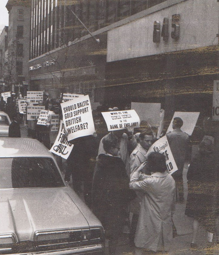 Operation Goldfinger (June 1967/68) was the first and probably the most intensively prepared for and successfully executed worldwide public protest in BATUN’s history. The Soviets claimed that the Baltic gold and ships that had been evacuated to the West were their property. For a long time, both sides had been making claims against the other for the restitution of property, like the Baltic gold, or investment losses caused by the other side. The UK Government, which continued to the de jure recognition of the Baltic States after World War II ended, maintained that only the, currently non-existent, governments of the independent Baltic States could legitimately claim the gold. By 1951, the unclaimed gold had become the property of the government, and after 1967 the disposal of the gold became a sensitive political issue as the Parliament moved to pass a law regarding its disposal. The UK and USSR had begun negotiations regarding their respective claims in 1940. Over the next 25 years, the intermittent negotiations made little progress due to disagreements over the legitimacy and the value of the many claims. Finally, in February 1967, the newly elected Labor Government, in search of a success in foreign relations, cleverly agreed with the USSR to finesse their disagreements. A year-and-a-half later, after repeated, contentious debates, the British Parliament passed the Foreign Compensation Act of 1969. The Act determined that the money received from the sale of the Baltic gold and other assets could be used to pay the USSR for £ 0.5 million worth of consumer goods and settle the claims of British creditors against the USSR. Thereby, Prime Minister Harold Wilson would have ended forever the long, unsuccessful negotiations with the USSR over mutual claims and satisfied the British creditors without a cost to the taxpayer, while maintaining its de jure non-recognition policy regarding the annexation of the Baltic states.