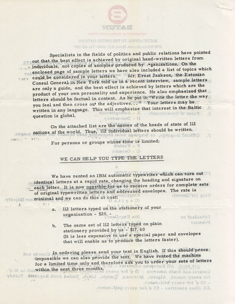 In 1968, the 50th anniversary of the declarations of independence in all three Baltic countries provided the reason for BATUN’s first extended public diplomacy and lobbying campaign. BATUN organized the sending of letters to the heads of state of UN Member States from Baltic exiles – individuals and organizations – and their friends. The campaign was called “Baltic Power”. The letters asked that the Baltic Question needed to be raised or, if it had already been raised, supported at the UN. The campaign was proposed in 1967 and the letters were written in 1968.