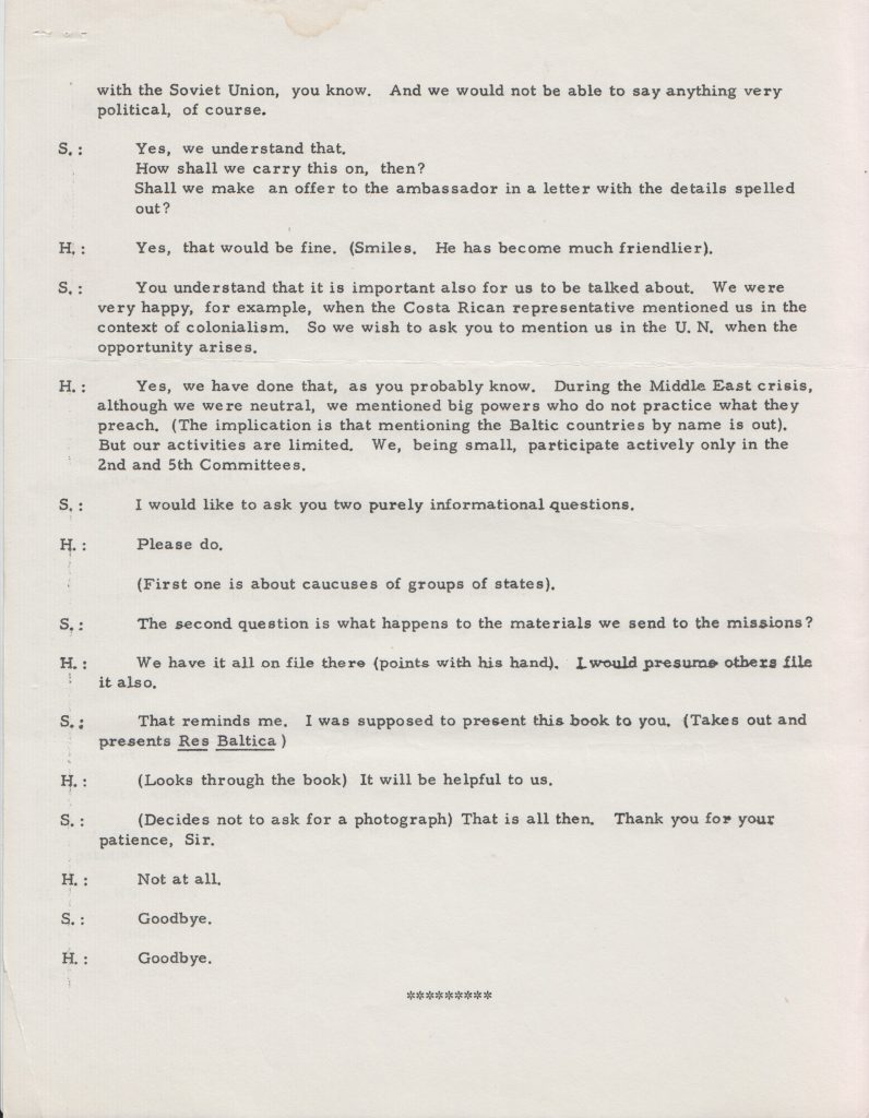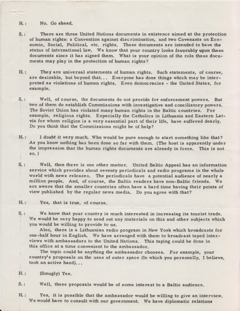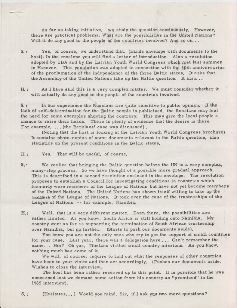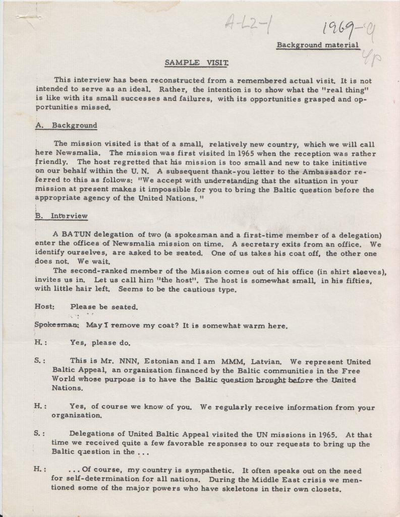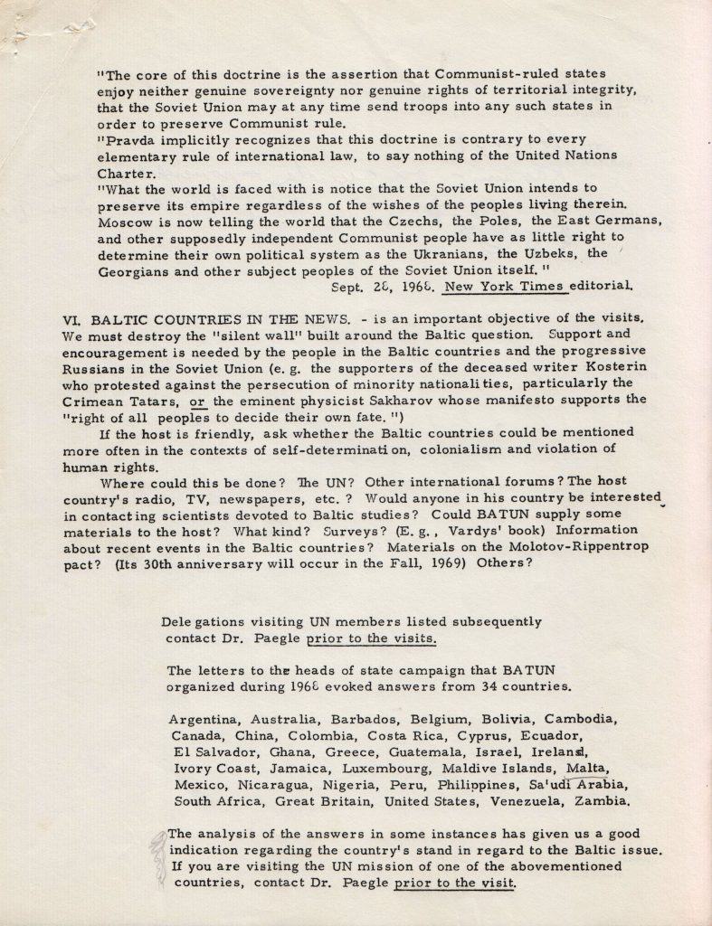 The main tool of BATUN was visiting the permanent missions of the UN Member States in New York. The visits played a special role in 1968 when they were part of the activities related to the 50th anniversaries of the proclamation of the independence of Estonia, Latvia, and Lithuania. The original idea was to create ten two-person, bi-ethnic delegations to undertake 15-20 missions to be backed and financed by Baltic exile organizations. The campaign took about two years. In June 1968 the BATUN Annual Meeting authorized the visits. They began on 23 December 1968 and lasted into the summer of 1969. By that time 86 permanent missions had been visited or had materials mailed to them. In 39 of the permanent missions, the heads of the mission – ambassadors or the chargés d’affaires – received the BATUN delegations. About ninety people had been recruited to make the visits, but only sixty actually participated. In late 1968, the delegates were provided about fifty pages of instructional materials and samples of the materials to be presented during the visits. After each visit, the members of the delegation would fill out a report on the visit and send a thank-you letter to the host.