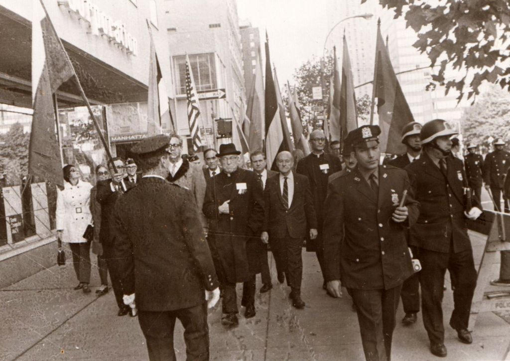 The rally actually took place in the plaza around the corner from the UN, since the street in front UN headquarters had been closed off to traffic. However, at the end of the rally, the last speaker Msgr. Balkunas  announced that ‘these kind policemen are now going to allow us to march to the UN’. He stepped to the barricades lifted one aside and started walking. He was peacefully followed by the all the rallygoers. And the police did not stop anyone. At that time, many of the NYC police were of either Irish or Italian descent, and therefore Catholic, so perhaps that’s why they hesitated to stop them. Later the crowd proudly marched past the UN headquarters with their Estonian, Latvian and Lithuanian flags flying.