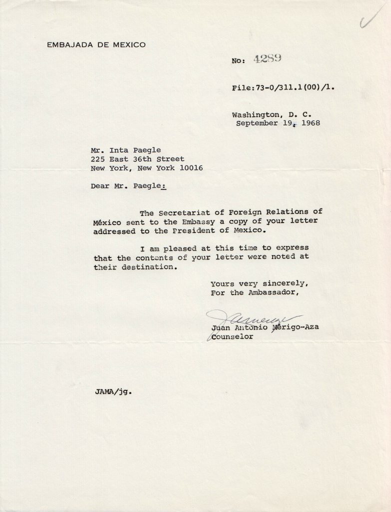 Response to Inta Paegle from Juan Antonio Norigo-Aza Counselor to the Ambassador of Mexico, 1968. Source: LNA LVA F.2944.