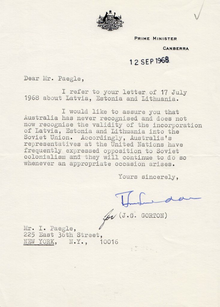 Response to Inta Paegle from John G.Gorton, Prime Minister of Australia, 1968. Source: LNA LVA F.2944.